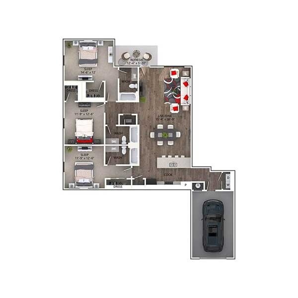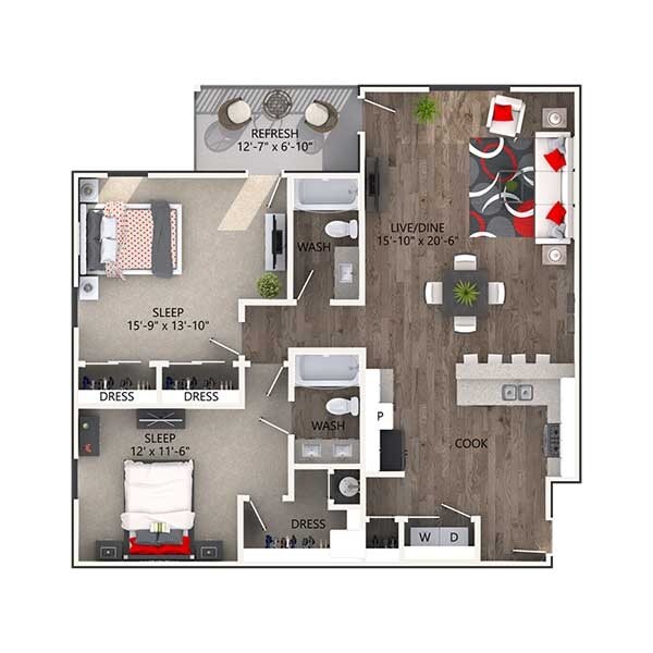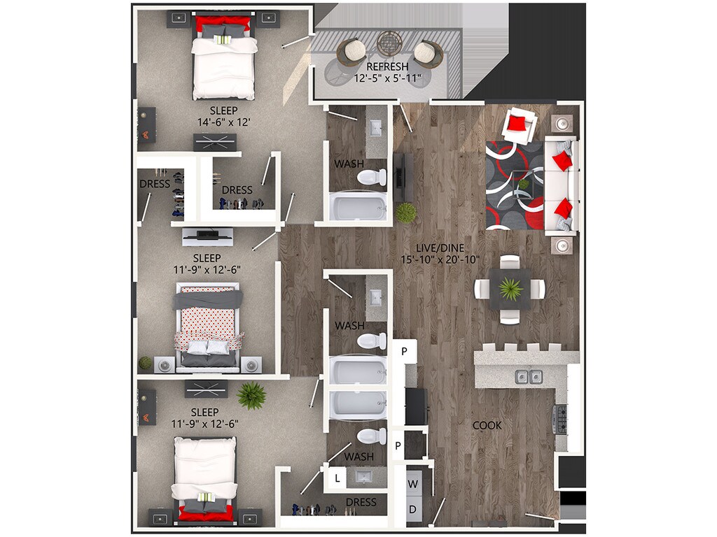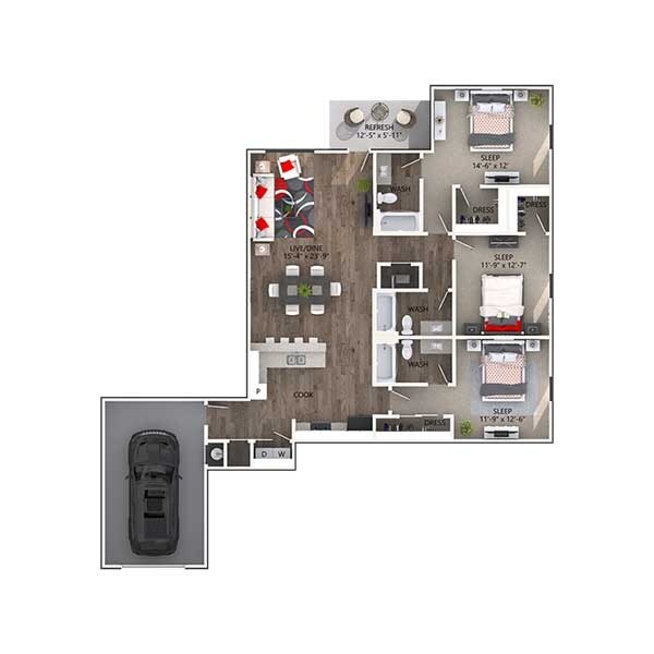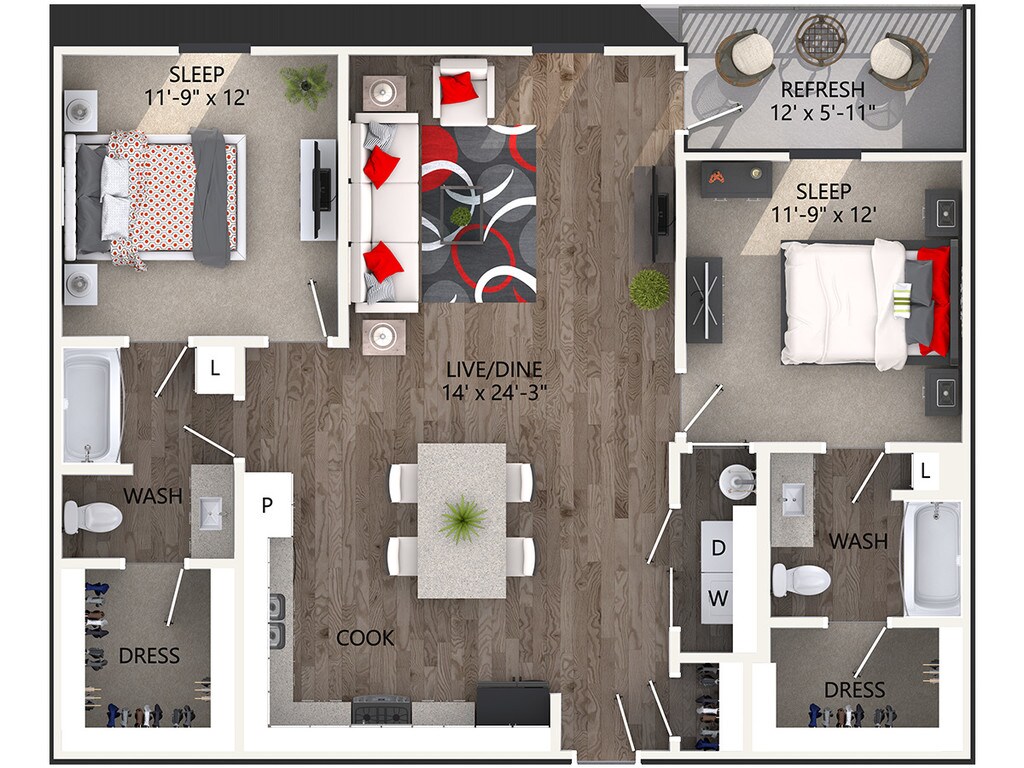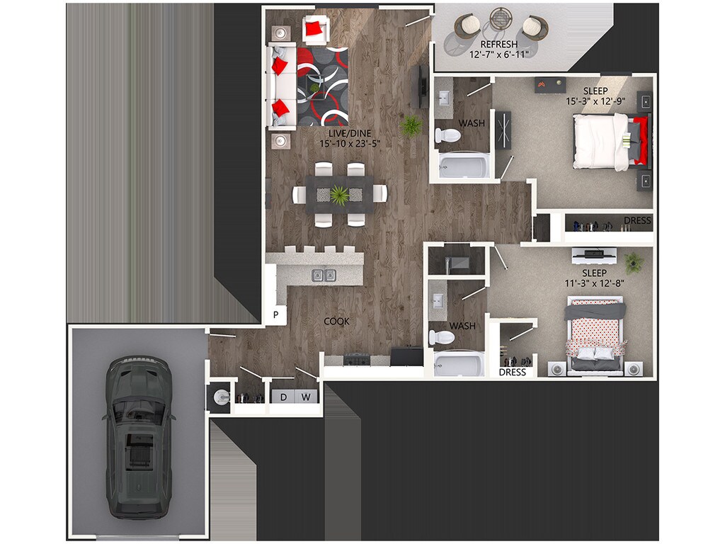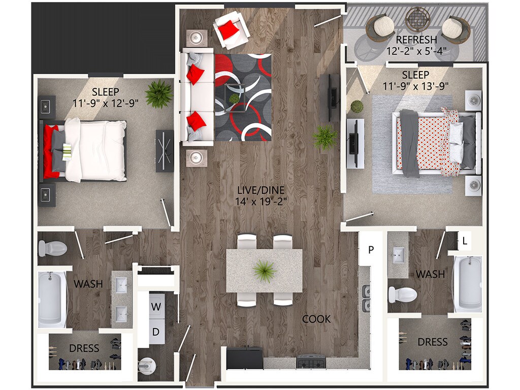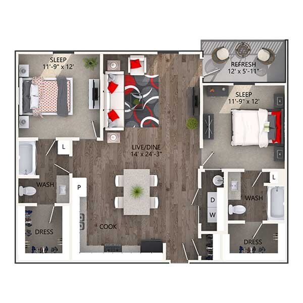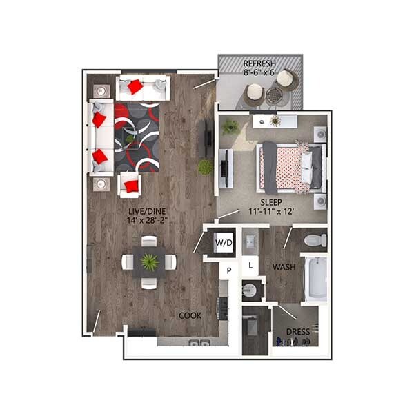 Modelo de apartamento: 1 Bedroom 1 Bathroom$1,3251 Dormitorio, 1 Baño, 778 sq ftDisponible Ahora![]()