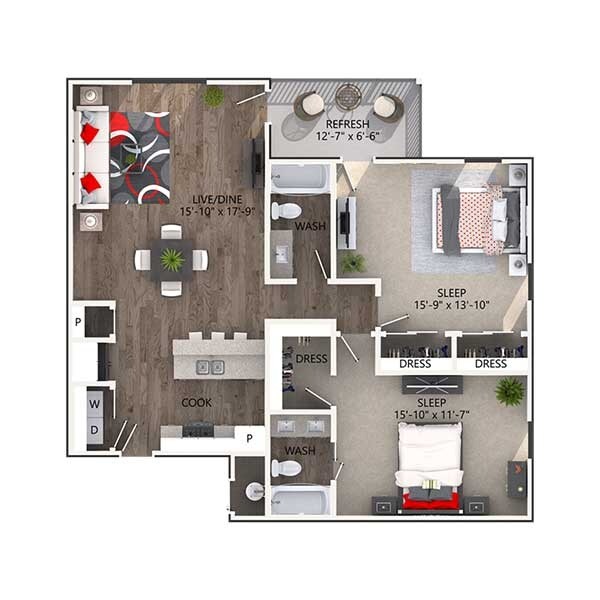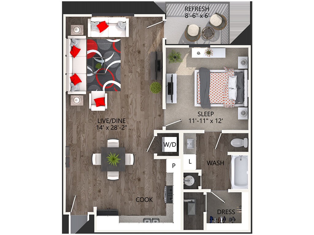 Modelo de apartamento: 1 Bedroom 1 Bathroom$1,6151 Dormitorio, 1 Baño, 790 sq ftDisponible February 24, 2026![]()