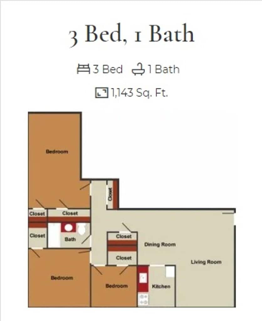Modelo de apartamento: 3 Bed$1,9453 Dormitorios, 1 Baño, 1143 sq ftDisponible AhoraPlanosFotos![]()