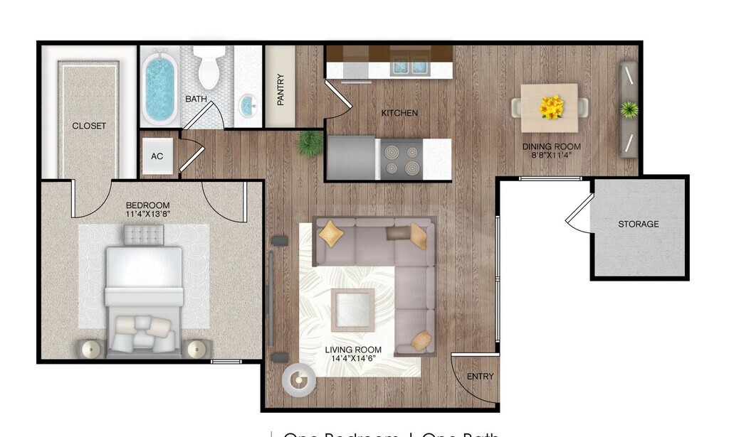 1 Dormitorio, 1 Baño, 1200 pies²El más grandeEsta opción tiene las unidades más grandes para este modeloGalería del Modelo