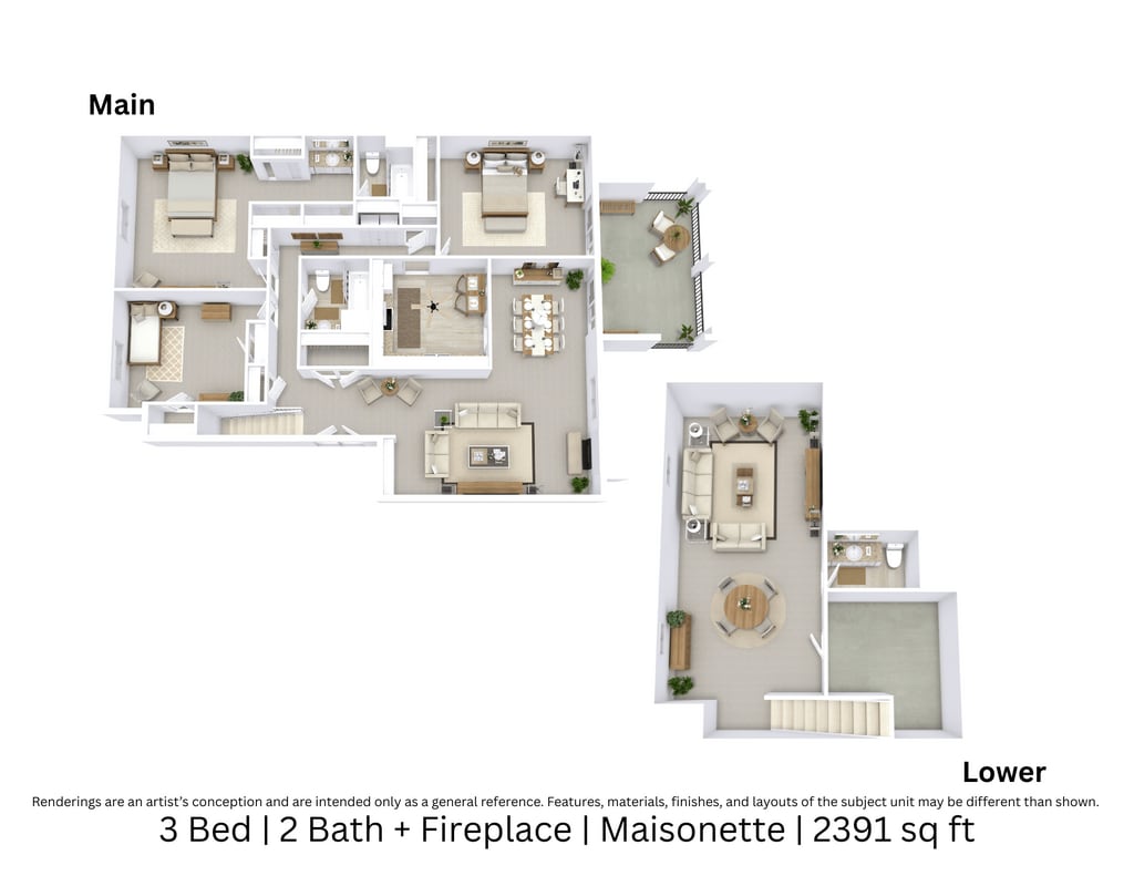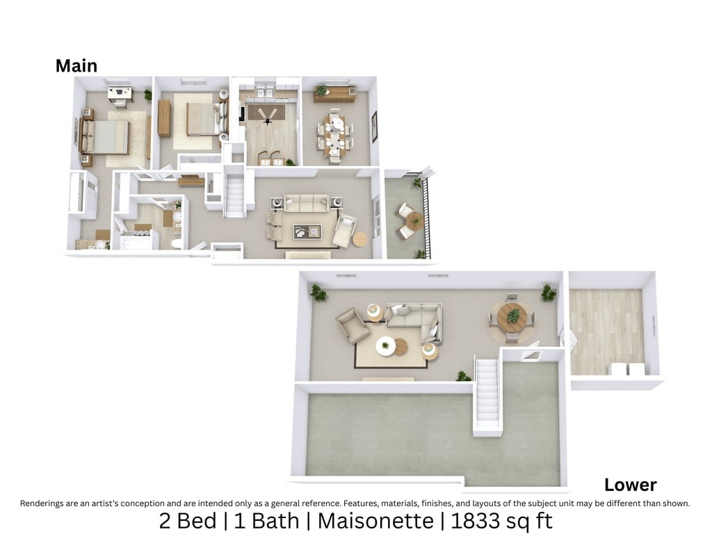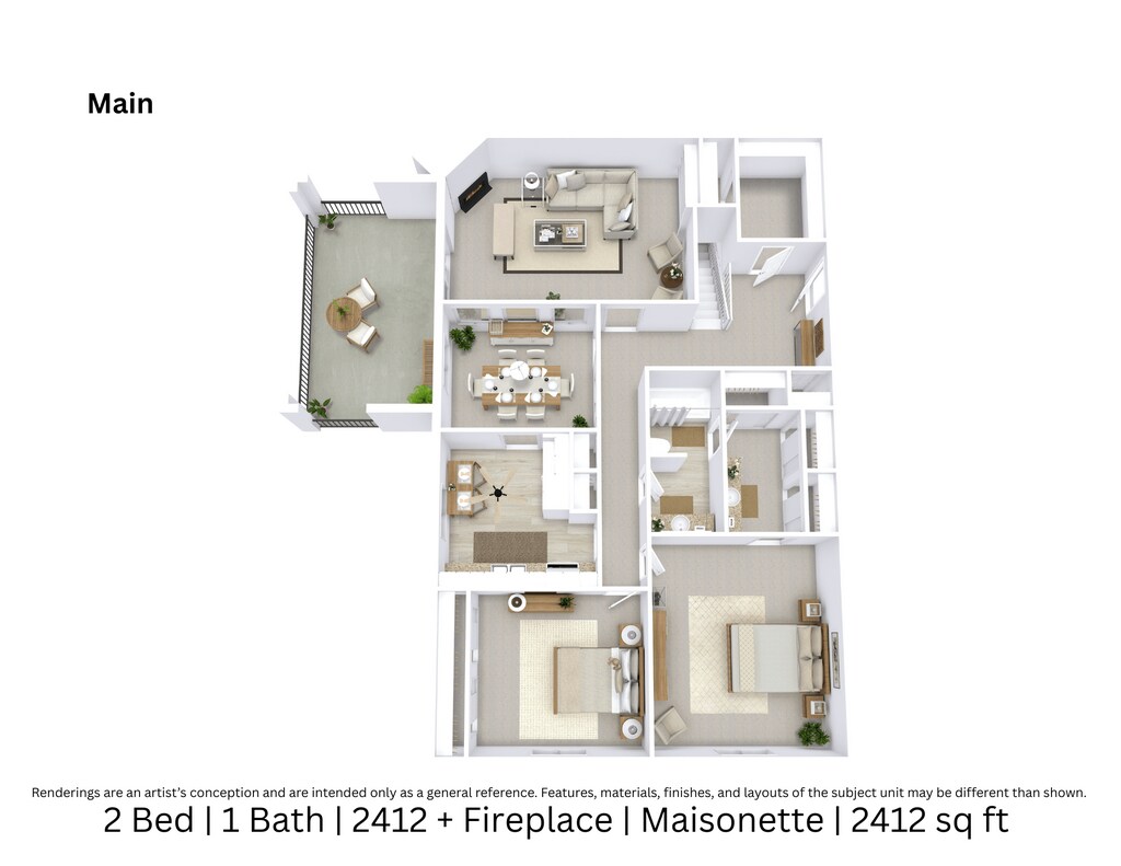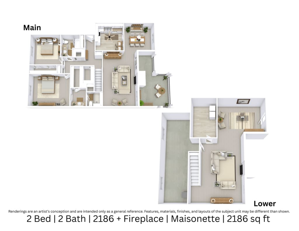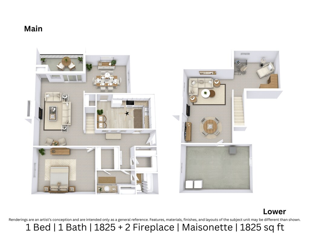 1 Bed | 1 Bath + Fireplace | 1222 sq ft - Plano 2 1 Bed | 1 Bath |Maisonette | 1395 sq ft