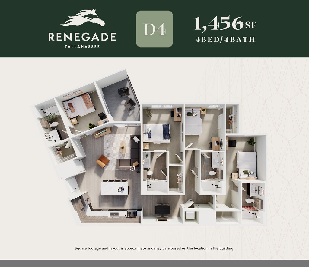 Modelo de apartamento: D44 Dormitorios, 4 Baños, 1456 sq ftDisponible Ahora![]()