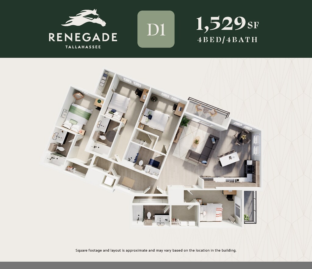 Modelo de apartamento: D14 Dormitorios, 4 Baños, 1529 sq ftDisponible Ahora![]()