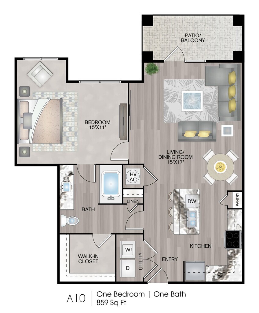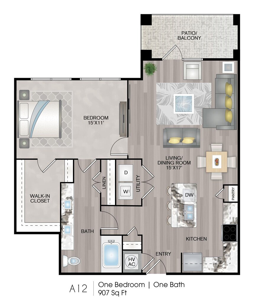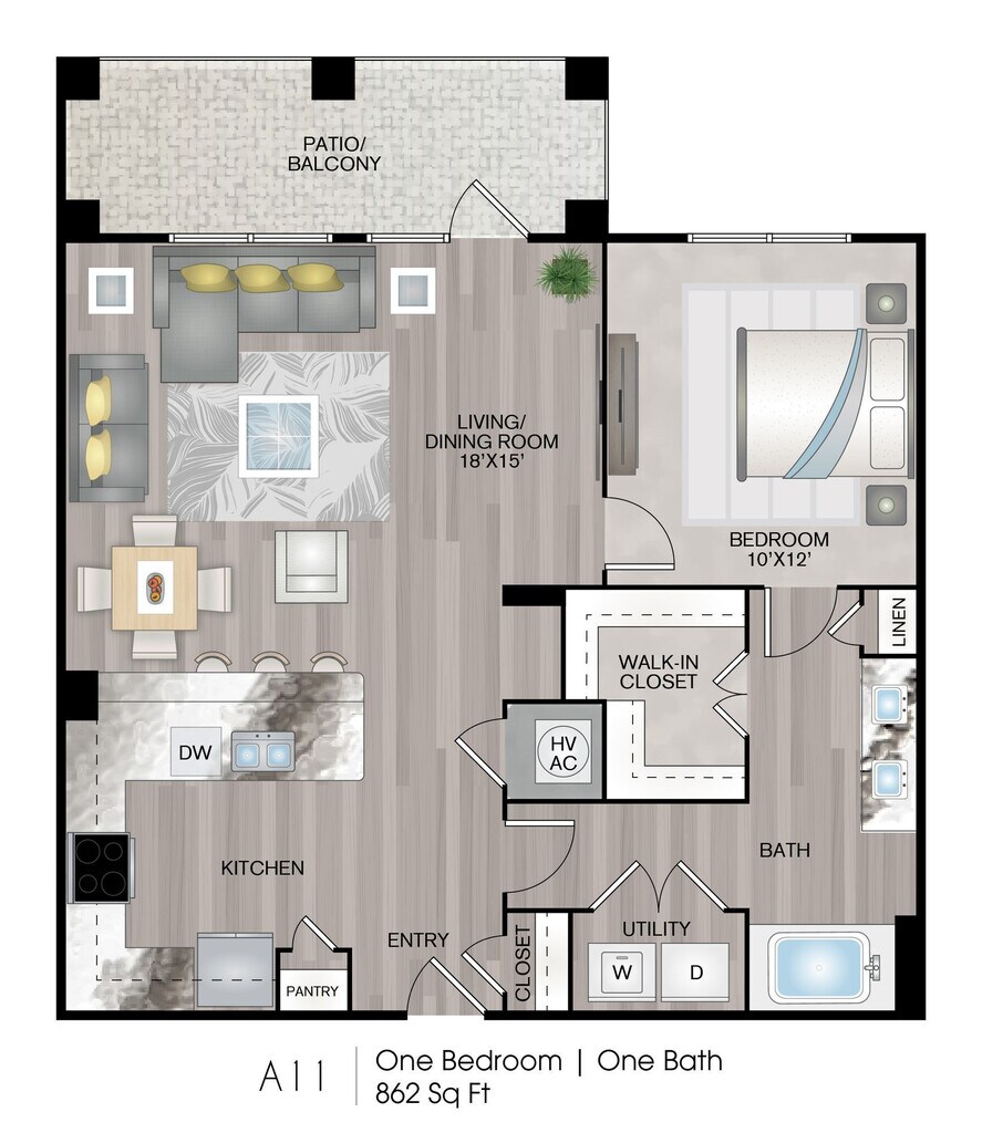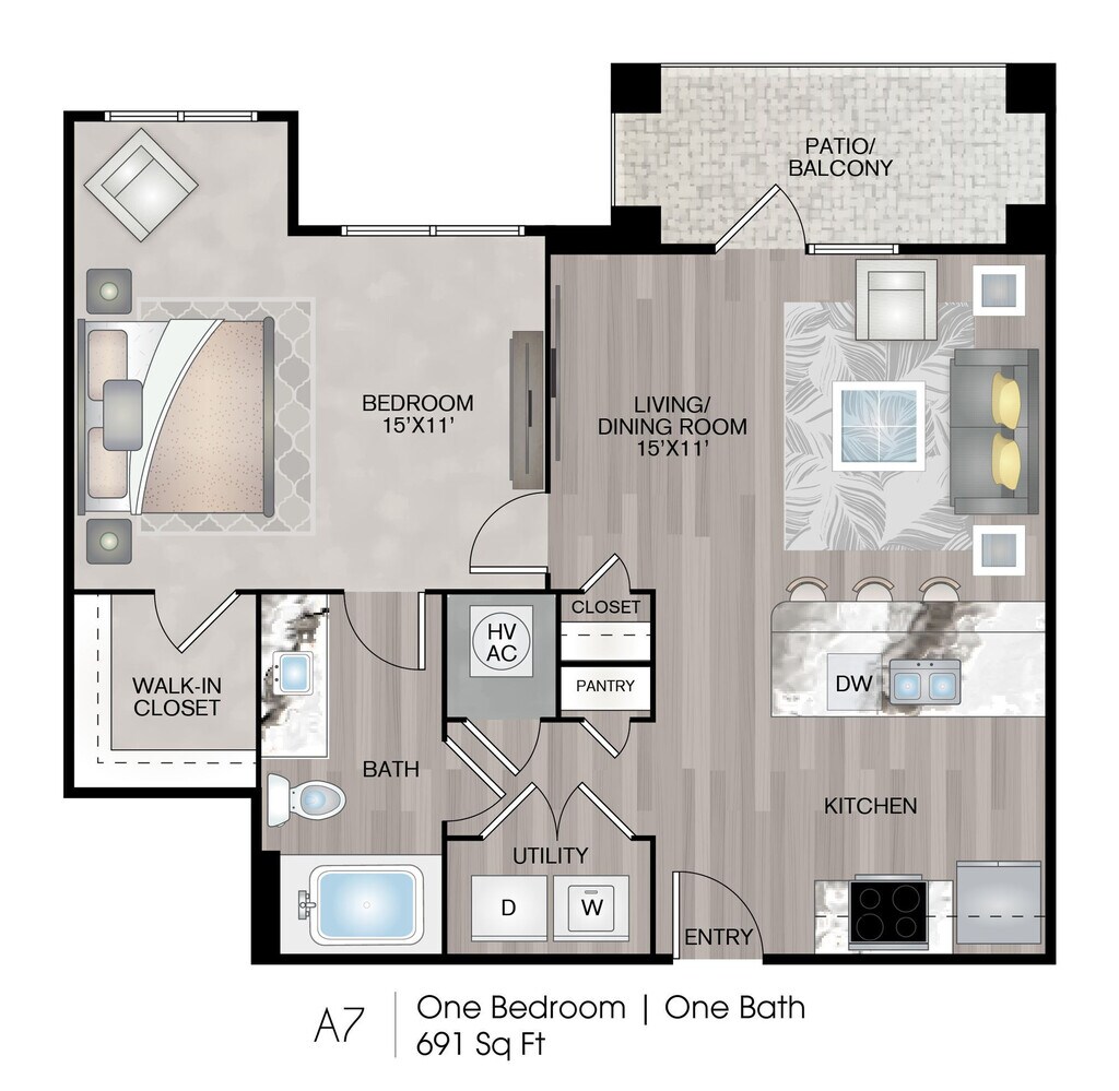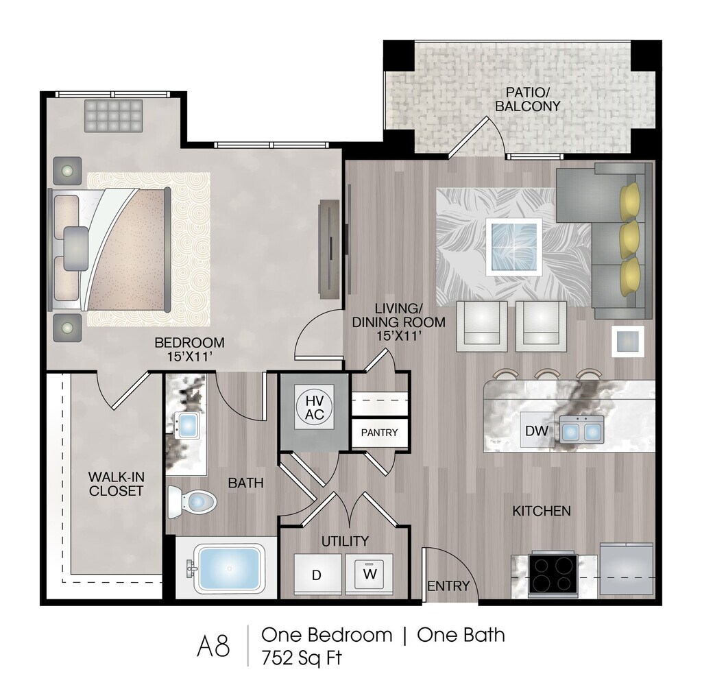 Modelo de apartamento: A1Desde $1,2241 Dormitorio, 1 Baño, 587-591 sq ftDisponible Ahora![]()
