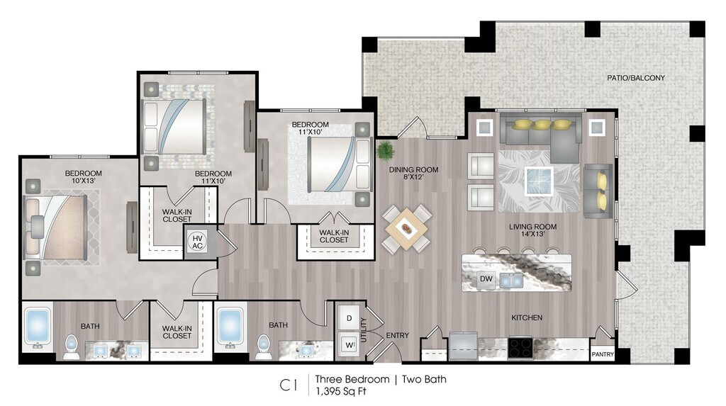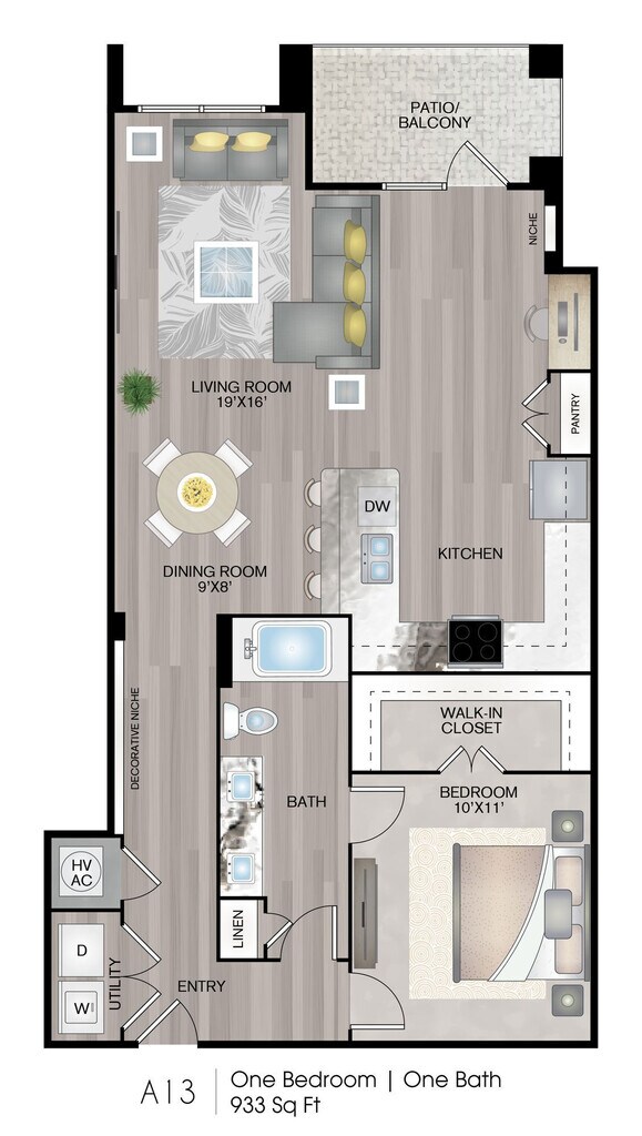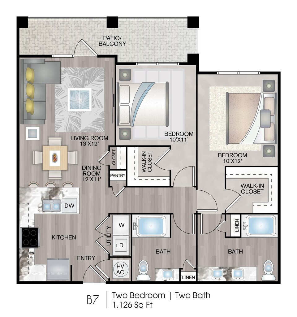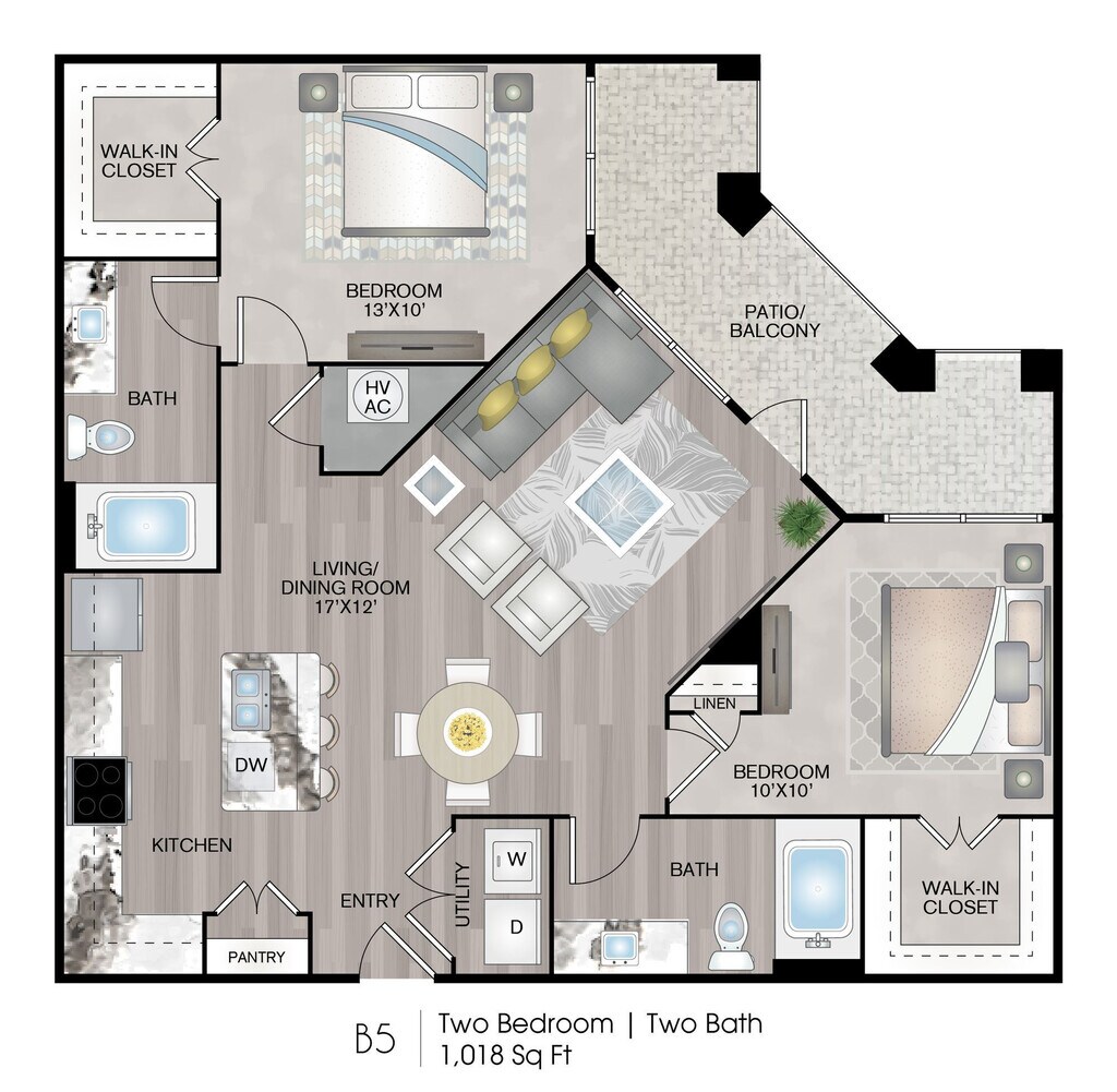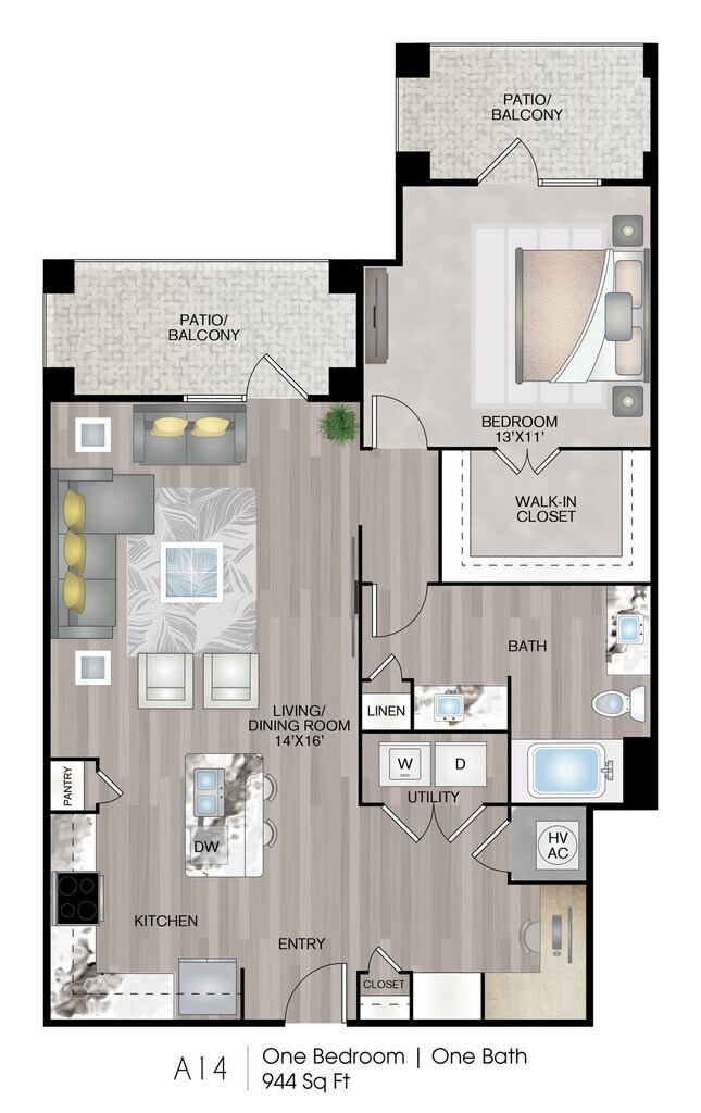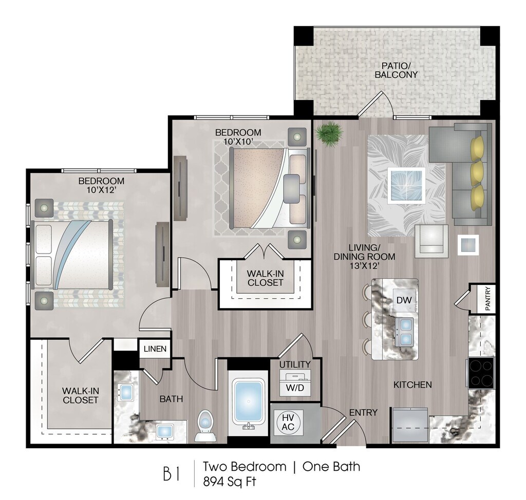 Modelo de apartamento: A1Desde $1,2241 Dormitorio, 1 Baño, 587-591 sq ftDisponible Ahora![]()