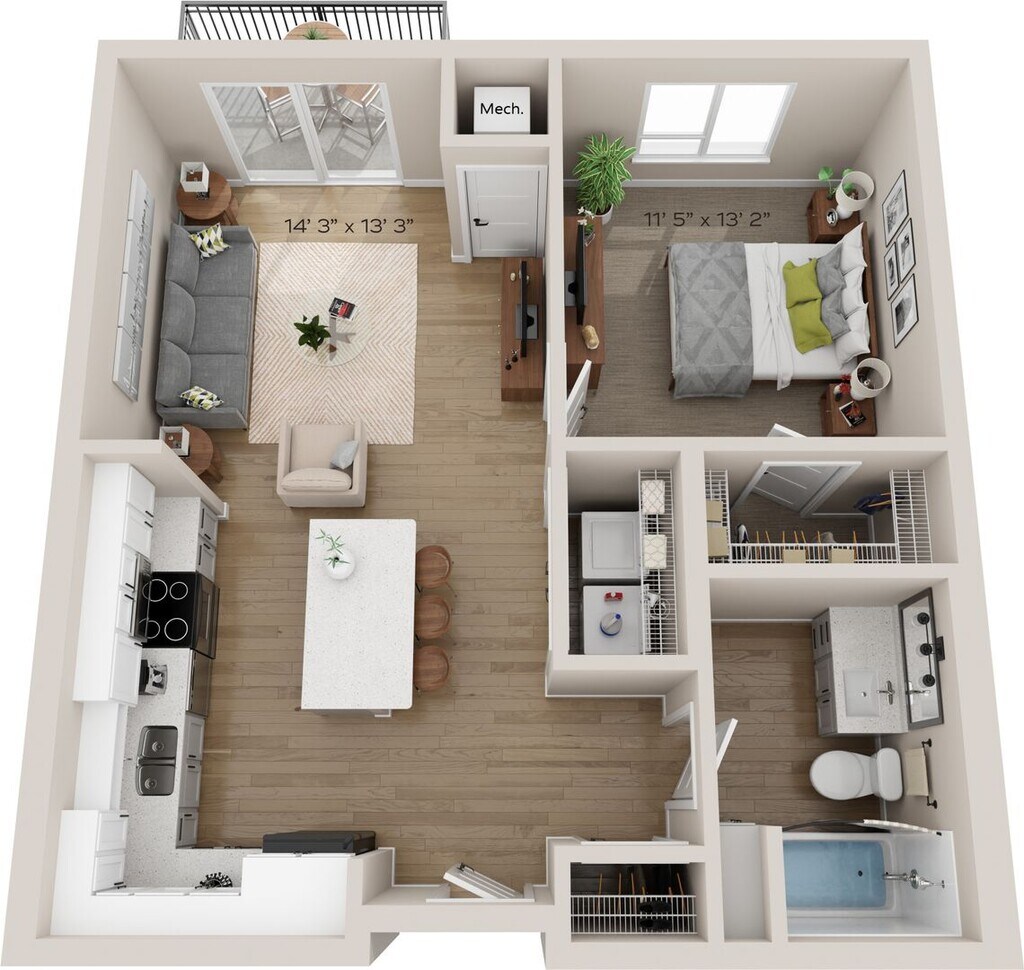 Modelo de apartamento: Wren (1-0)Desde $1,5551 Dormitorio, 1 Baño, 718 sq ftDisponible January 30, 2026PlanosFotos![]()