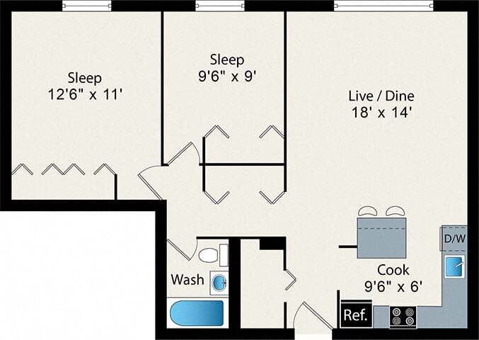 Modelo de apartamento: A11 Dormitorio, 1 Baño, 612 sq ftDisponible AhoraPlanosFotos![]()