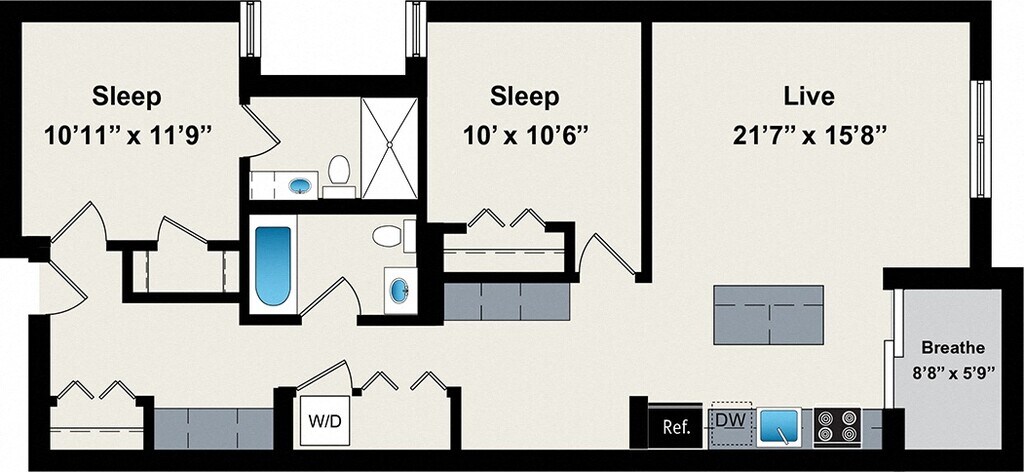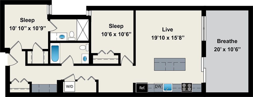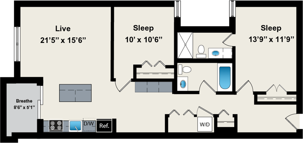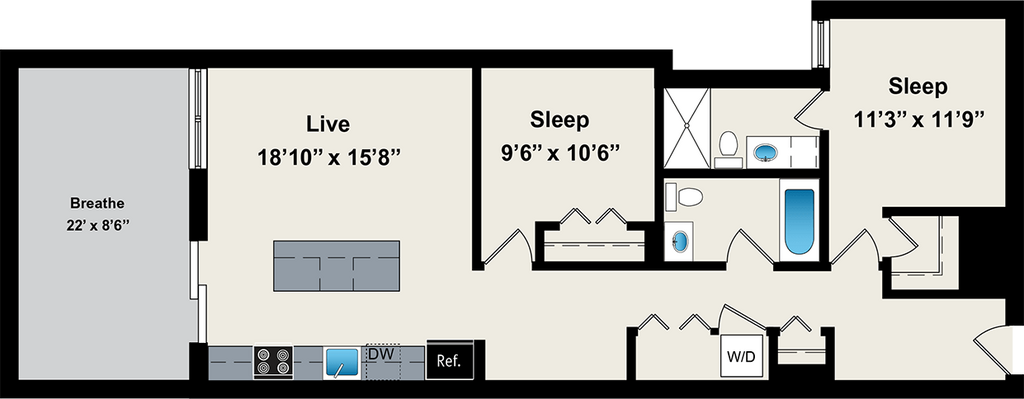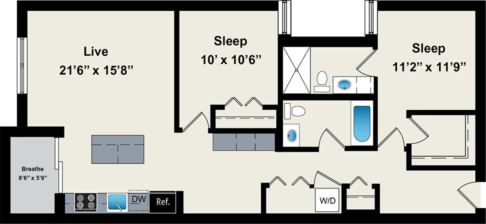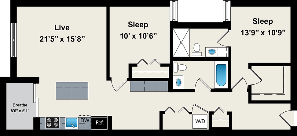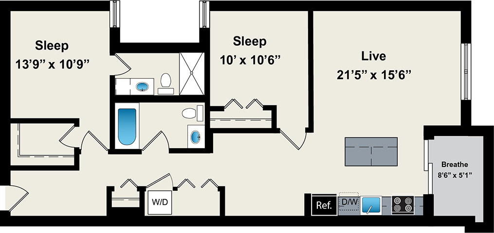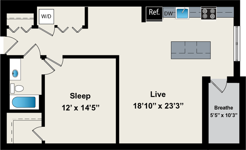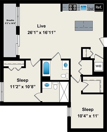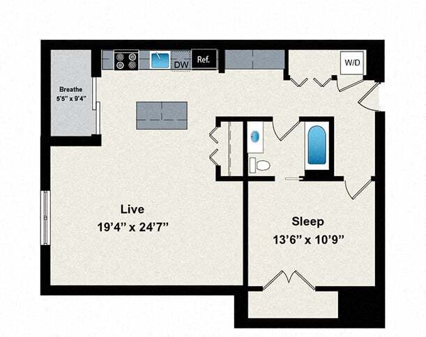 1 Dormitorio, 1 Baño, 800 pies²Disponible AhoraGalería del Modelo