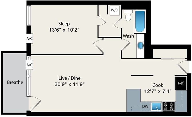 Modelo de apartamento: A21 Dormitorio, 1 Baño, 696 sq ftDisponible Ahora![]()