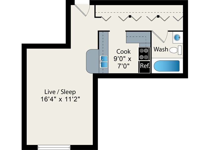 Modelo de apartamento: S1Estudio, 1 Baño, 332 sq ftDisponible Ahora![]()