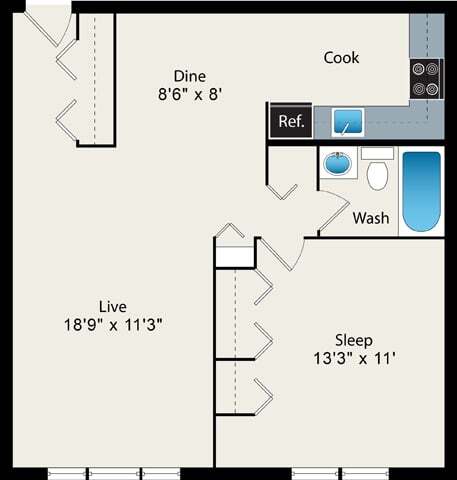 Modelo de apartamento: A41 Dormitorio, 1 Baño, 665 sq ftDisponible May 8, 2026![]()