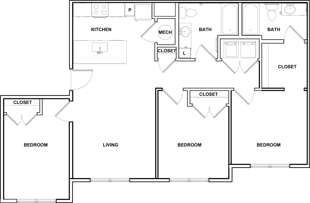 3 Dormitorios, 2 Baños, 1079 pies²Galería del Modelo