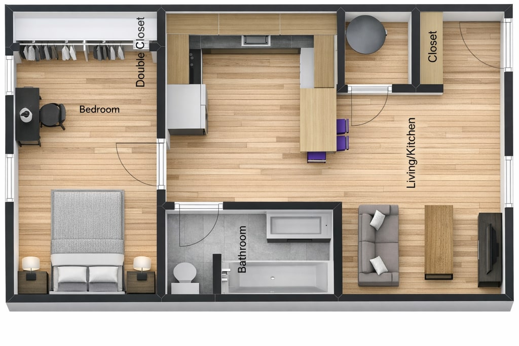 1 Dormitorio, 1 Baño, 500 pies²Disponible May 10Galería del Modelo