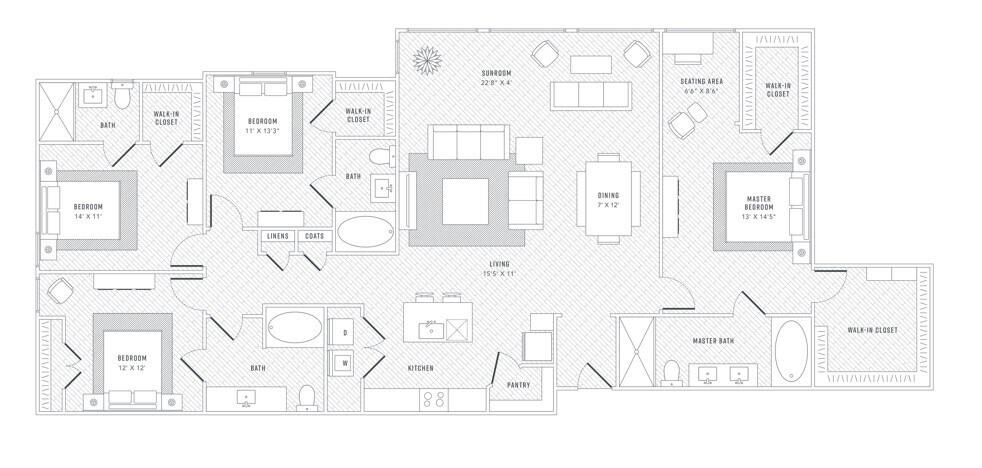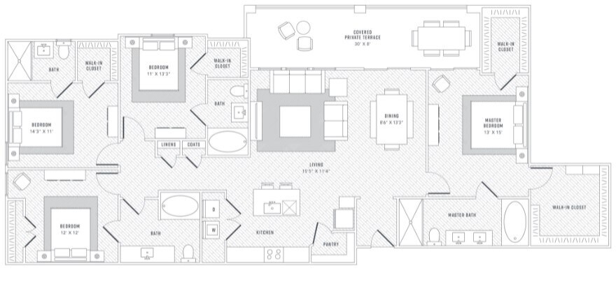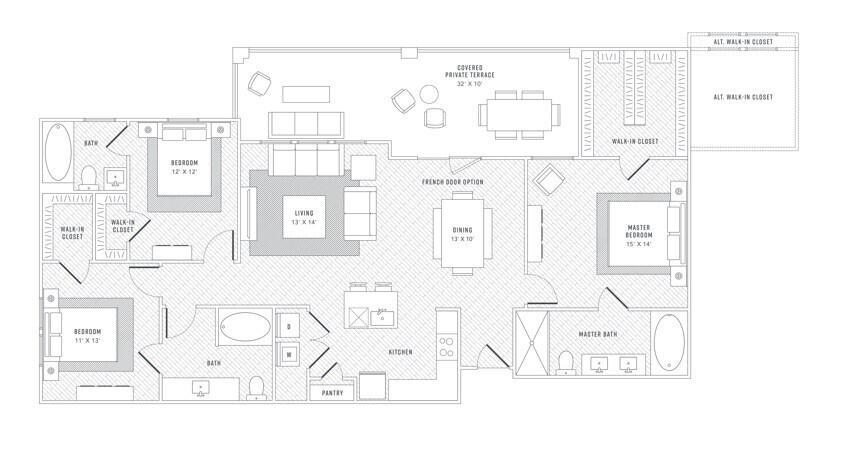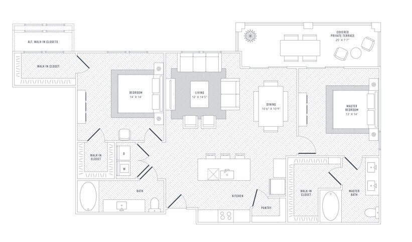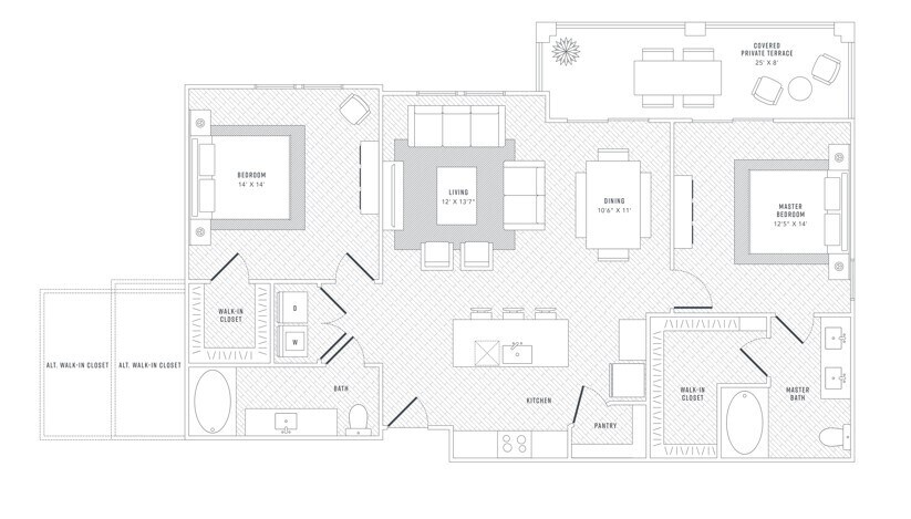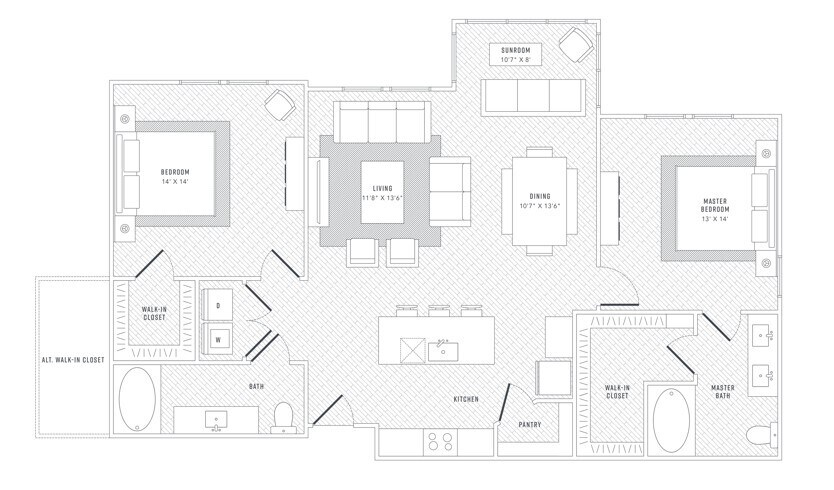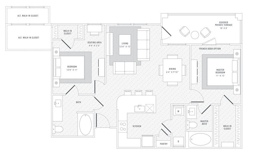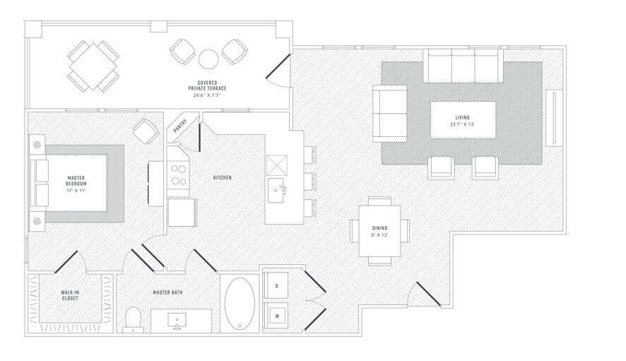 Modelo de apartamento: A1Desde $1,2271 Dormitorio, 1 Baño, 719-788 sq ftDisponible Ahora![]()