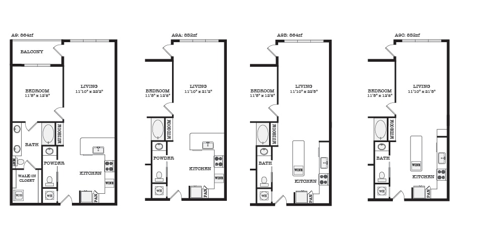 Modelo de apartamento: A91 Dormitorio, 1.5 Baños, 852-864 sq ftDisponible Ahora![]()