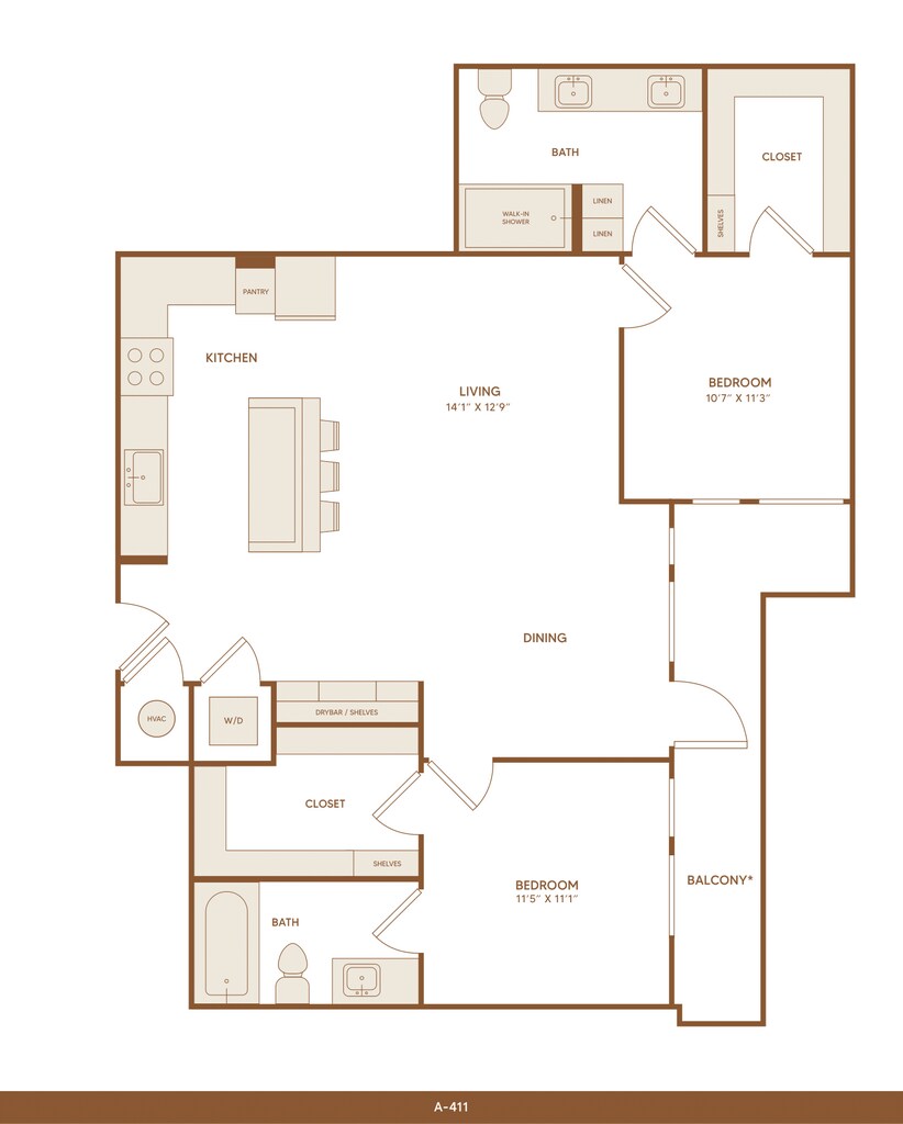 Modelo de apartamento: A41 Dormitorio, 1 Baño, 633 sq ftDisponible Ahora![]()