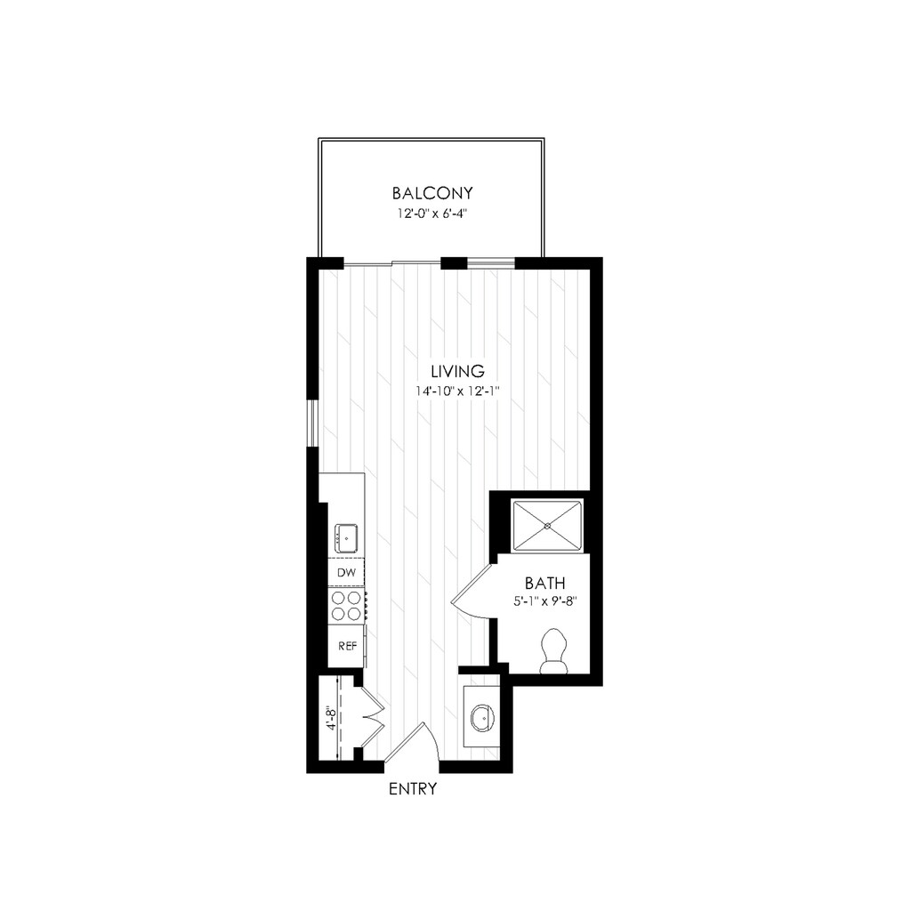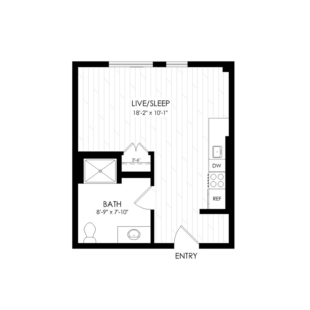 Modelo de apartamento: Studio - Regular 369 sqftDesde $1,183Estudio, 1 Baño, 369 sq ftDisponible AhoraLos planos son representaciones artísticas. Todas las dimensiones son aproximadas. El producto y las especificaciones reales pueden variar en tamaño o detalle. No todas las características están disponibles en cada vivienda en alquiler. Por favor, consulta con un representante para obtener más detalles.