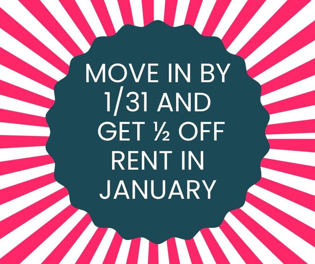 Move in by 1/31 and GET 1/2 OFF FIRST MONTH'S RENT~~Move in by 1/31 and GET 1/2 OFF FIRST MONTH'S RENT *on a 13 month lease