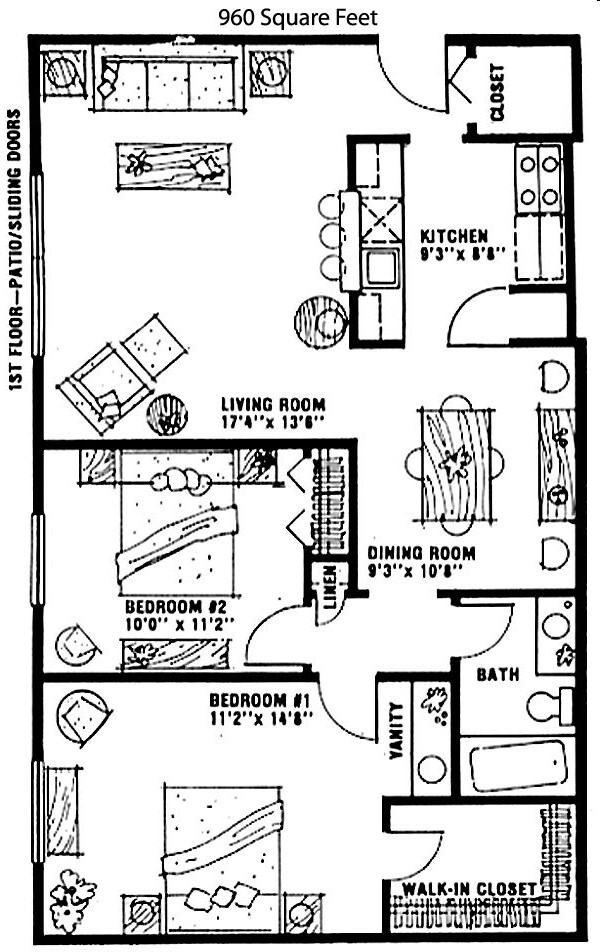 2 Dormitorios, 1 Baño, 960-1075 pies²Detalles de Diponibilidad