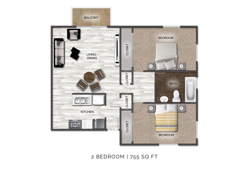 Modelo de apartamento: 2 Bedroom B$1,5172 Dormitorios, 1 Baño, 755 sq ftDisponible June 1, 2026Los planos son representaciones artísticas. Todas las dimensiones son aproximadas. El producto y las especificaciones reales pueden variar en tamaño o detalle. No todas las características están disponibles en cada vivienda en alquiler. Por favor, consulta con un representante para obtener más detalles.
