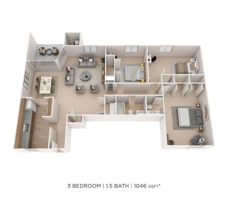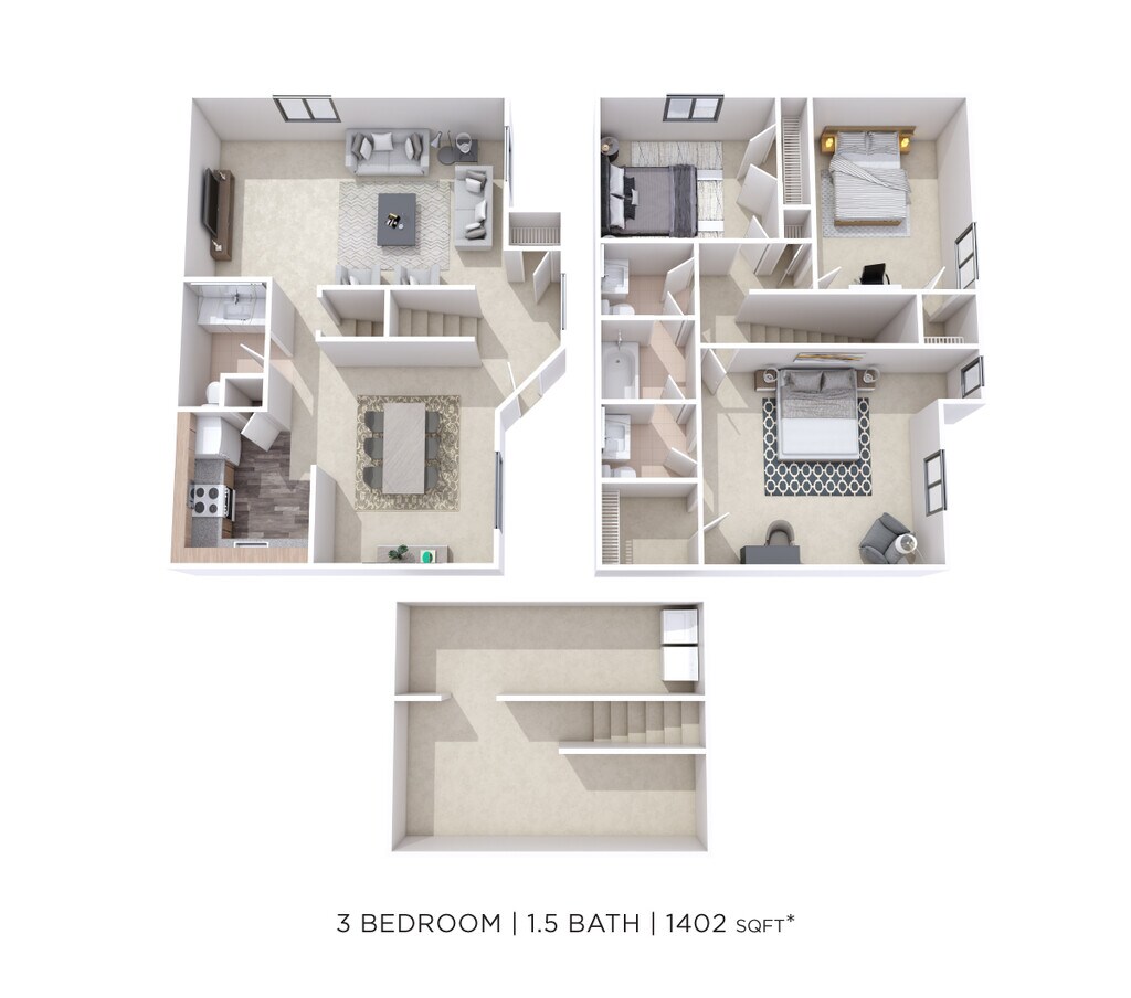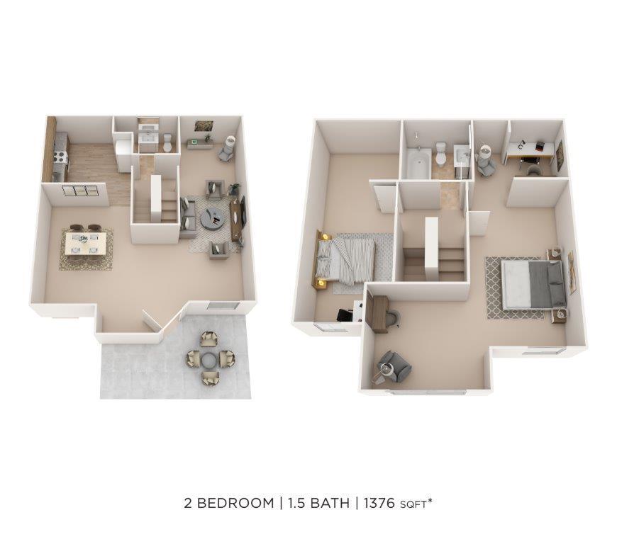 One Bedroom 1.5 Bath Townhome - 915 sqft - Plano 3 2 Dormitorios
