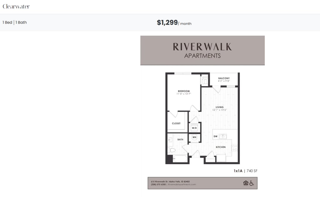 Riverwalk Apartments ofrece apartamentos de 1 a 2 Dormitorios desde $1,099 con 740–1,243 pies cuadrados. Aquí está el precio actual y la disponibilidad: