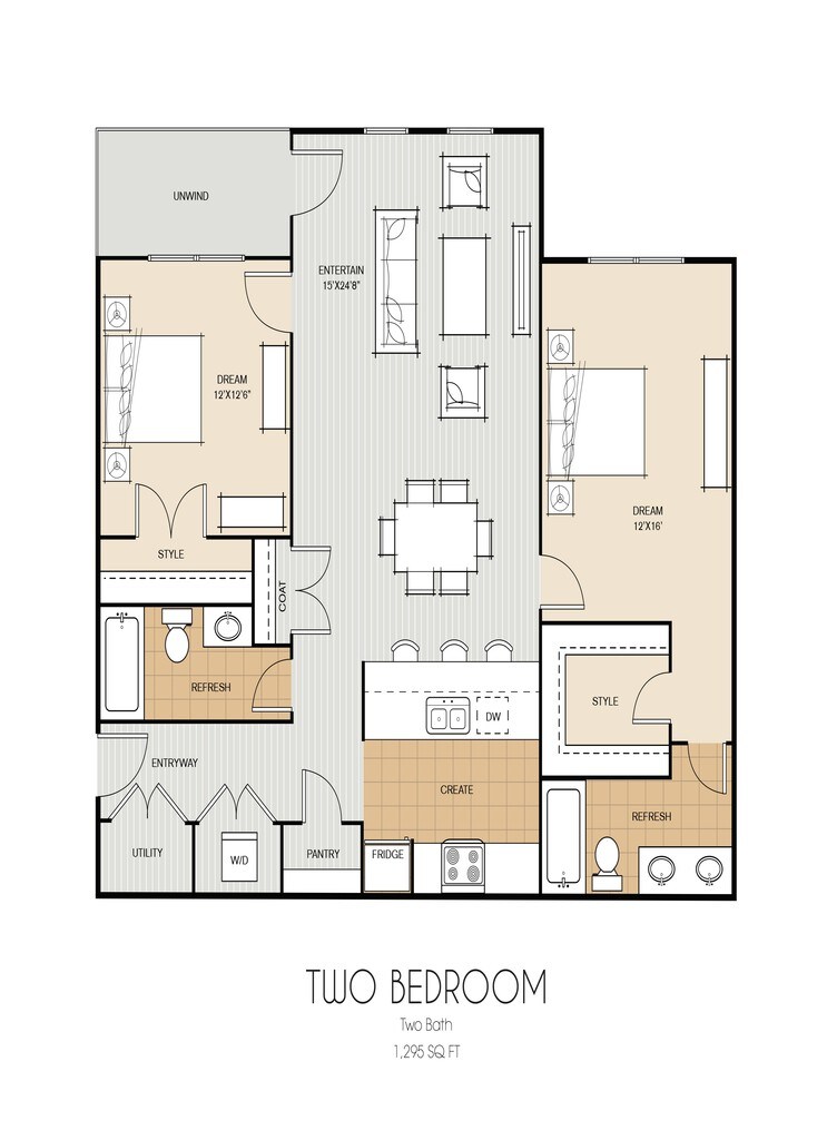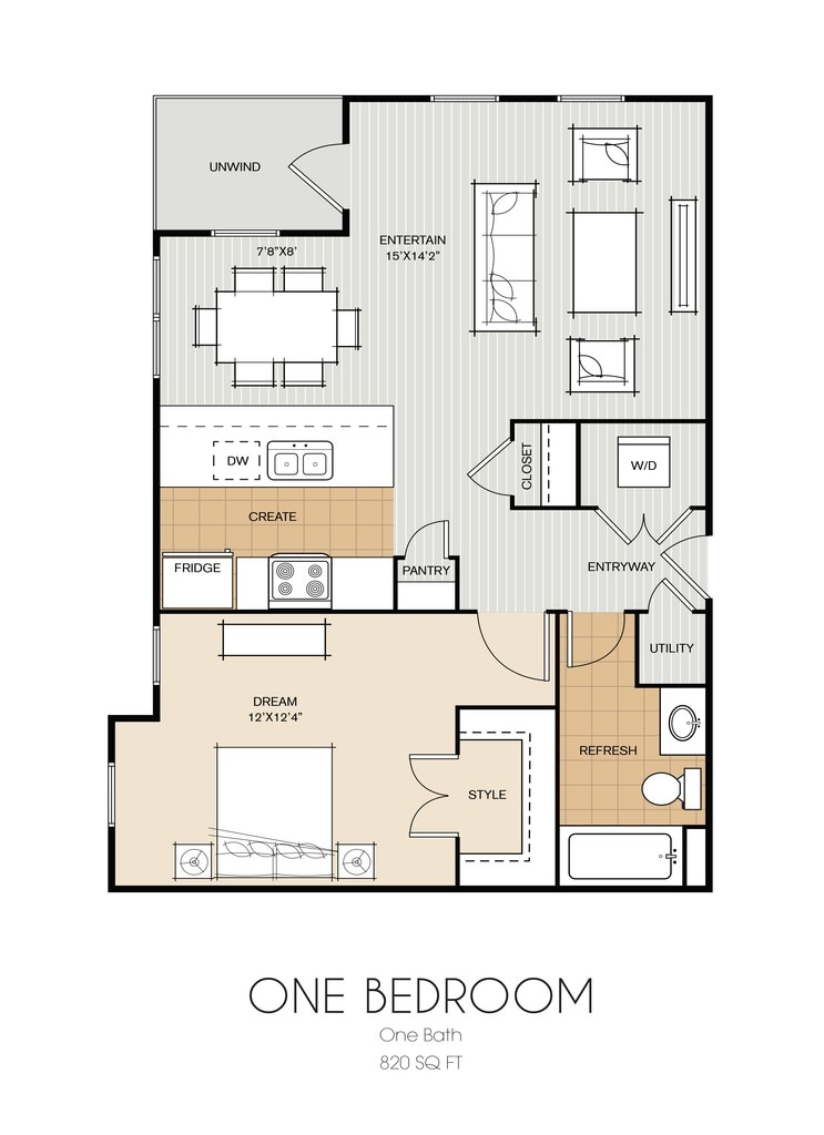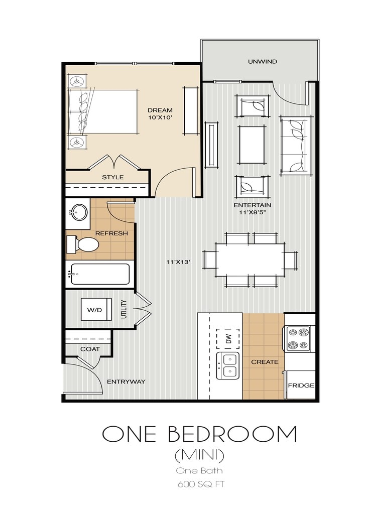 1 Dormitorio, 1 Baño, 600 pies²Disponible AhoraGalería del Modelo