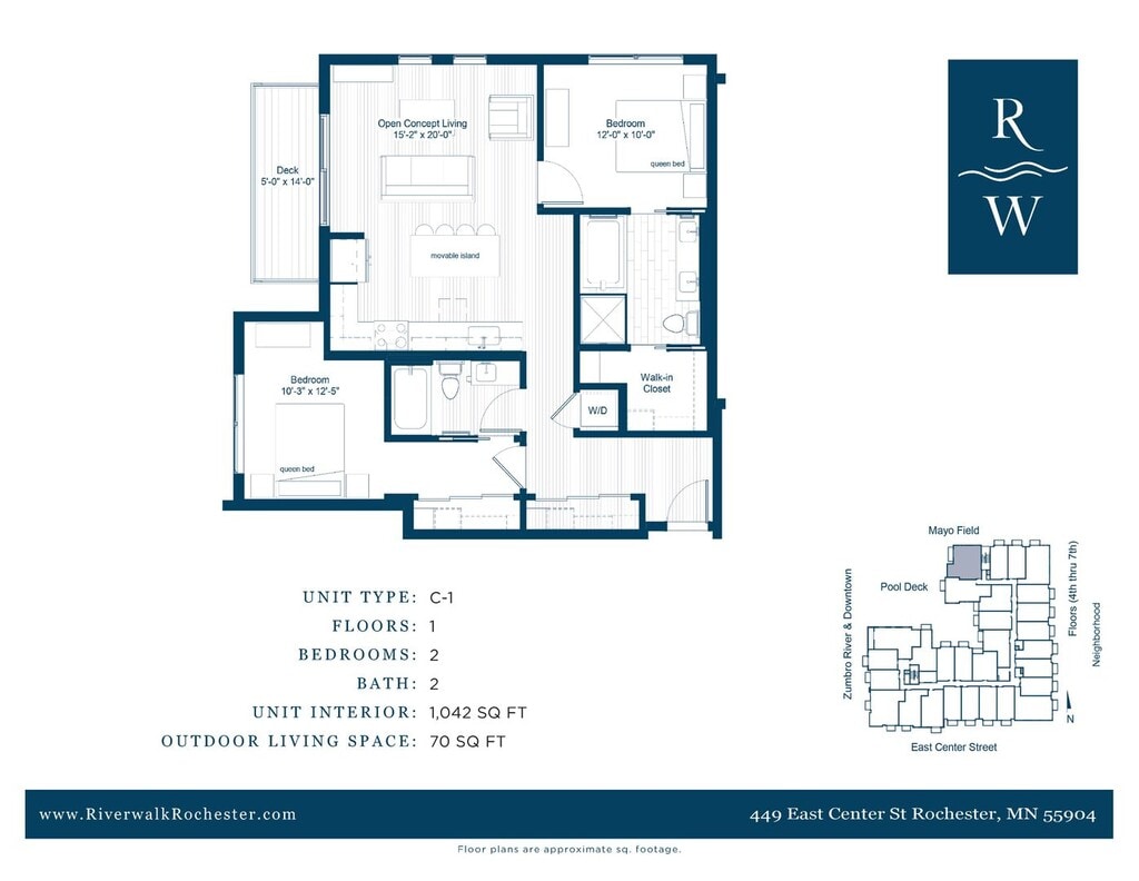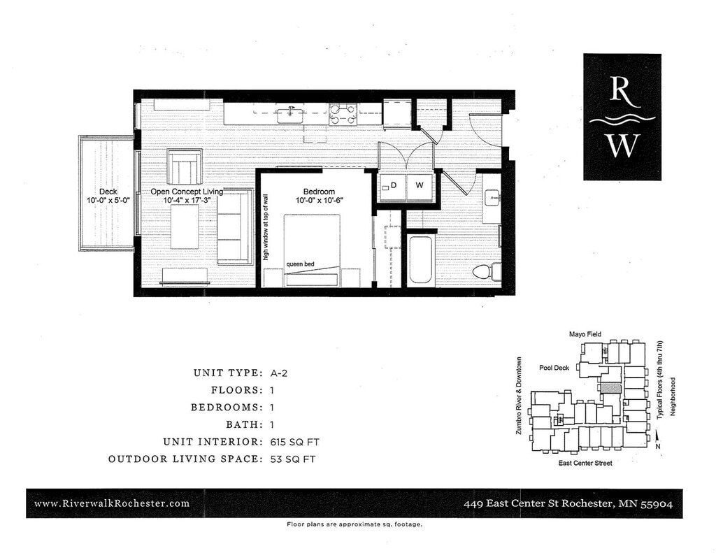 El único complejo de apartamentos de lujo en la ribera de Rochester. Rápido acceso al centro de Rochester. A solo unos pasos de distancia del acceso a skyway y senderos para bicicletas.