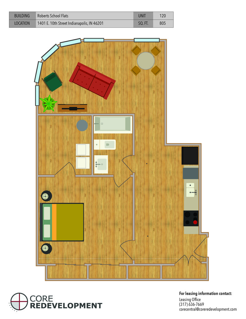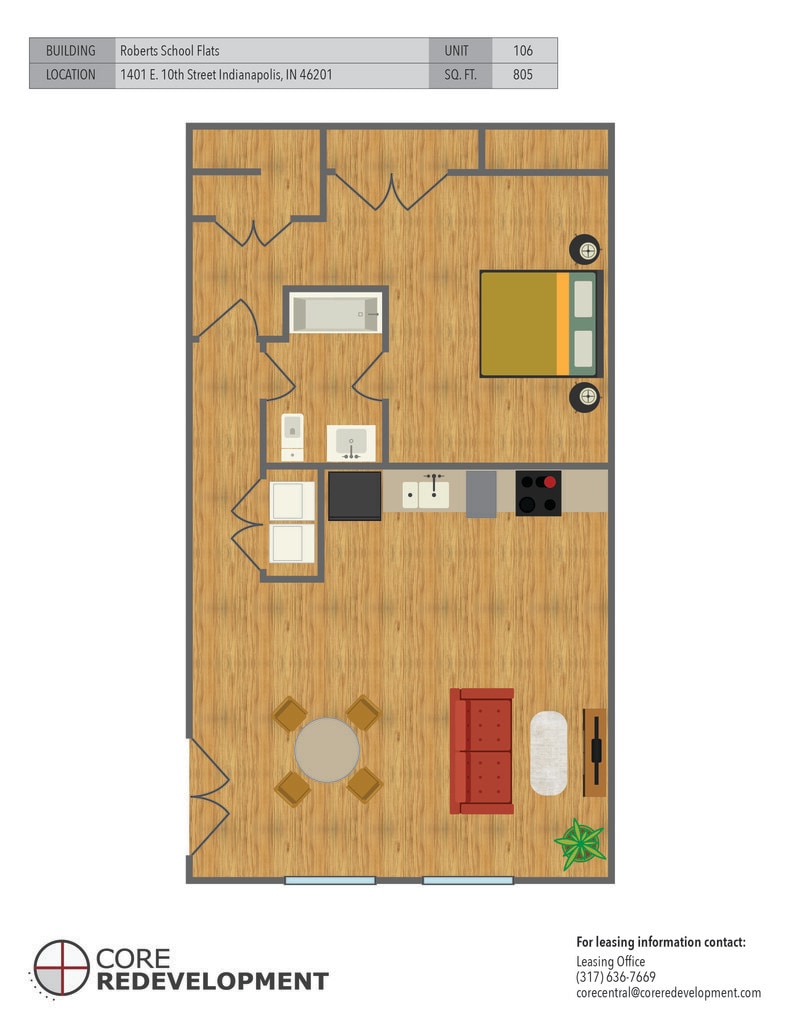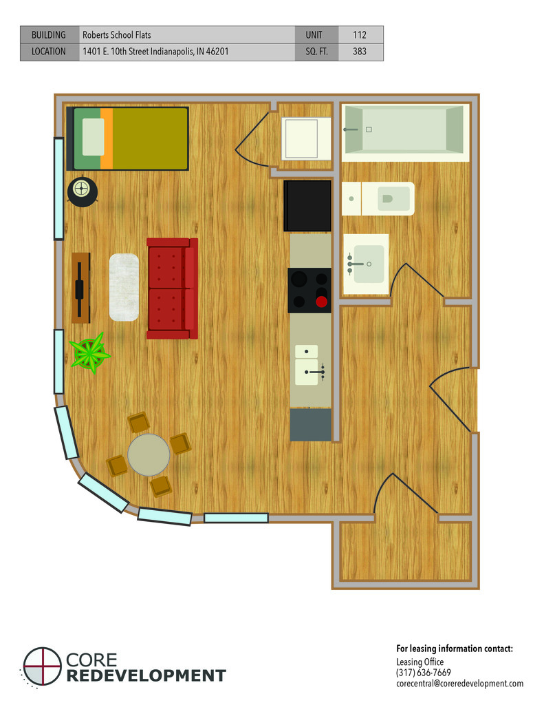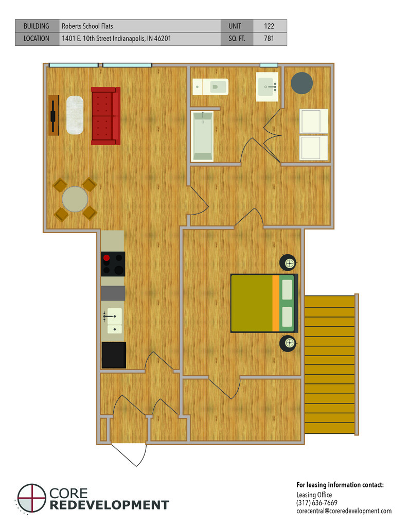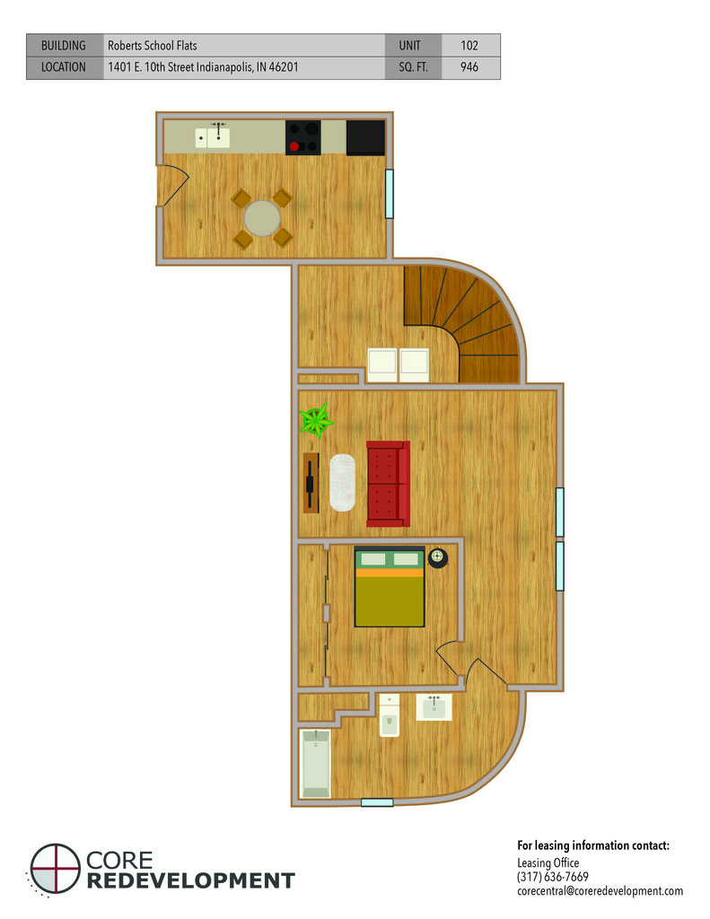 Roberts School Flats se encuentra en el Barrio Near Eastside y el código postal 46201 de Indianapolis, IN. Esta comunidad está gestionada profesionalmente por Core Redevelopment, LLC