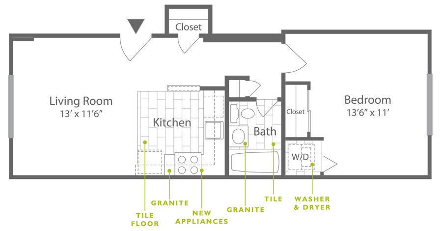 1 Dormitorio, 1 Baño, 571-623 pies²Disponible AhoraGalería del Modelo