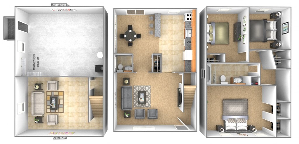 Modelo de apartamento: 3 Bedroom TownhomeDesde $1,9253 Dormitorios, 1.5 Baños, 1220 sq ftDisponible Ahora![]()