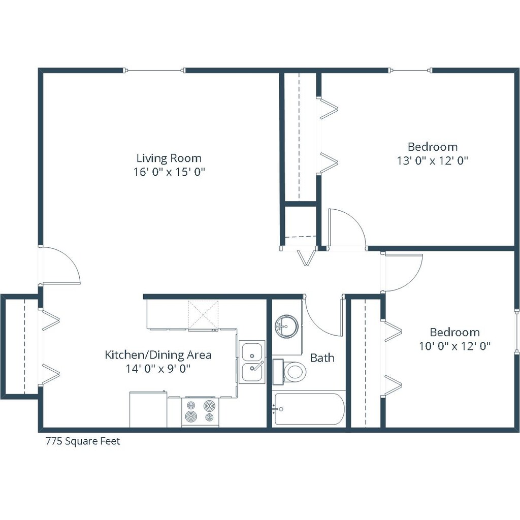 Modelo de apartamento: Two Bedroom 21A2 Dormitorios, 1 Baño, 775 sq ftDisponible AhoraTwo Bedroom 21A - Plano 1 Unidad de apartamento: 02-012Modelo de apartamento: Two Bedroom 21A2 Dormitorios, 1 Baño, 775 sq ftDisponible Ahora