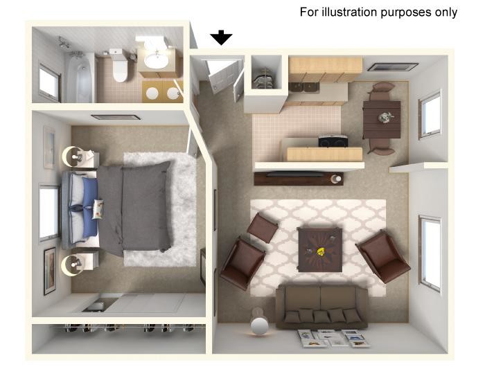 1 Dormitorio, 1 Baño, 526 pies²Disponible AhoraGalería del Modelo