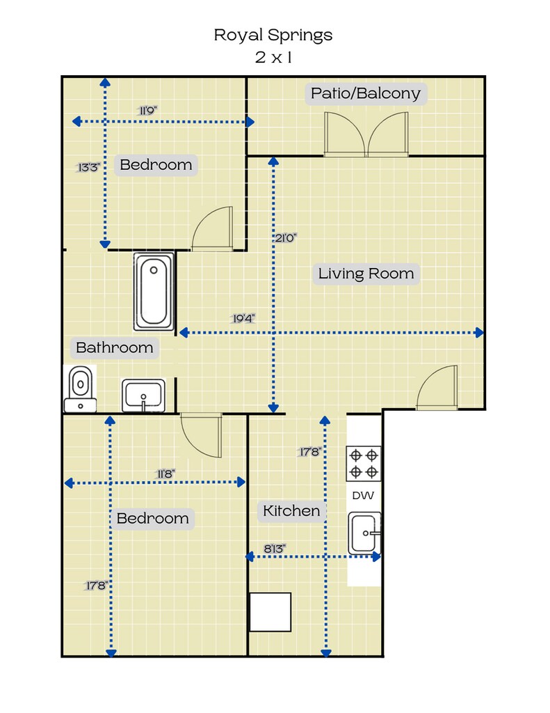 Royal Springs Apartments ofrece apartamentos de 2 Dormitorios desde $1,350 con 1,000–1,200 pies cuadrados. Aquí está el precio actual y la disponibilidad: