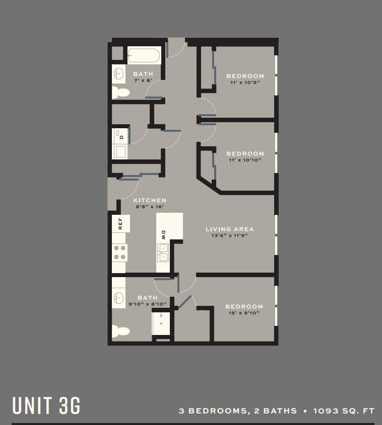 Unidad de apartamento: 113Modelo de apartamento: 3B$1,1543 Dormitorios, 2 Baños, 1124 sq ftDisponible November 1, 2025
