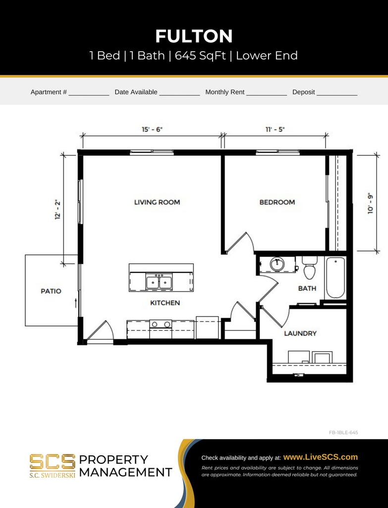 Modelo de apartamento: Fulton PII 1 BR Lower End$1,3791 Dormitorio, 1 Baño, 645 sq ftDisponible May 7, 2026PlanosFotos![]()
