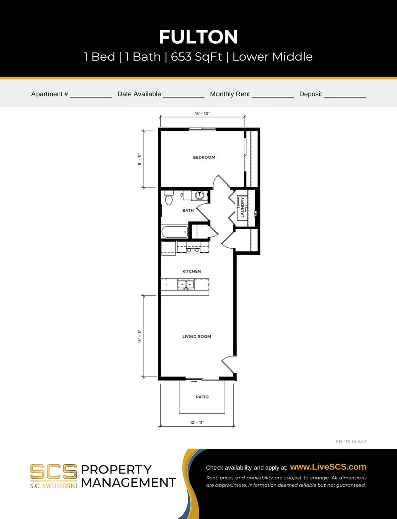 Fulton PII 1 BR Lower End - Plano Unidad de apartamento: EC 4242-01Modelo de apartamento: Fulton PII 1 BR Lower End$1,3791 Dormitorio, 1 Baño, 645 sq ftDisponible May 7, 2026Fulton PII 1 BR Lower Mid