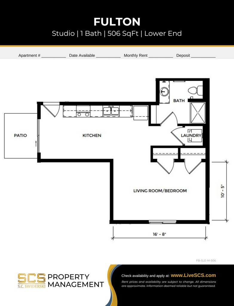 Modelo de apartamento: Fulton PII Studio$1,199Estudio, 1 Baño, 506 sq ftDisponible May 7, 2026PlanosFotos![]()