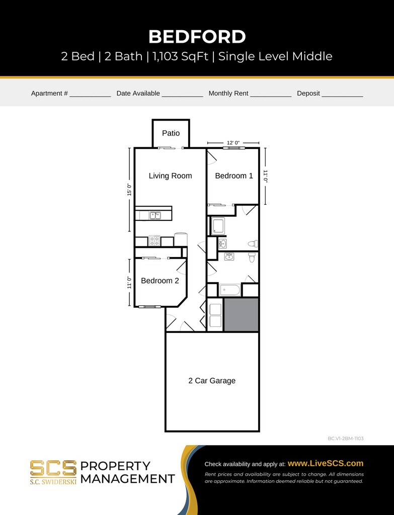 Modelo de apartamento: Bedford 2 BR2 Dormitorios, 2 Baños, 1103 sq ftDisponible December 6, 2025PlanosFotos![]()