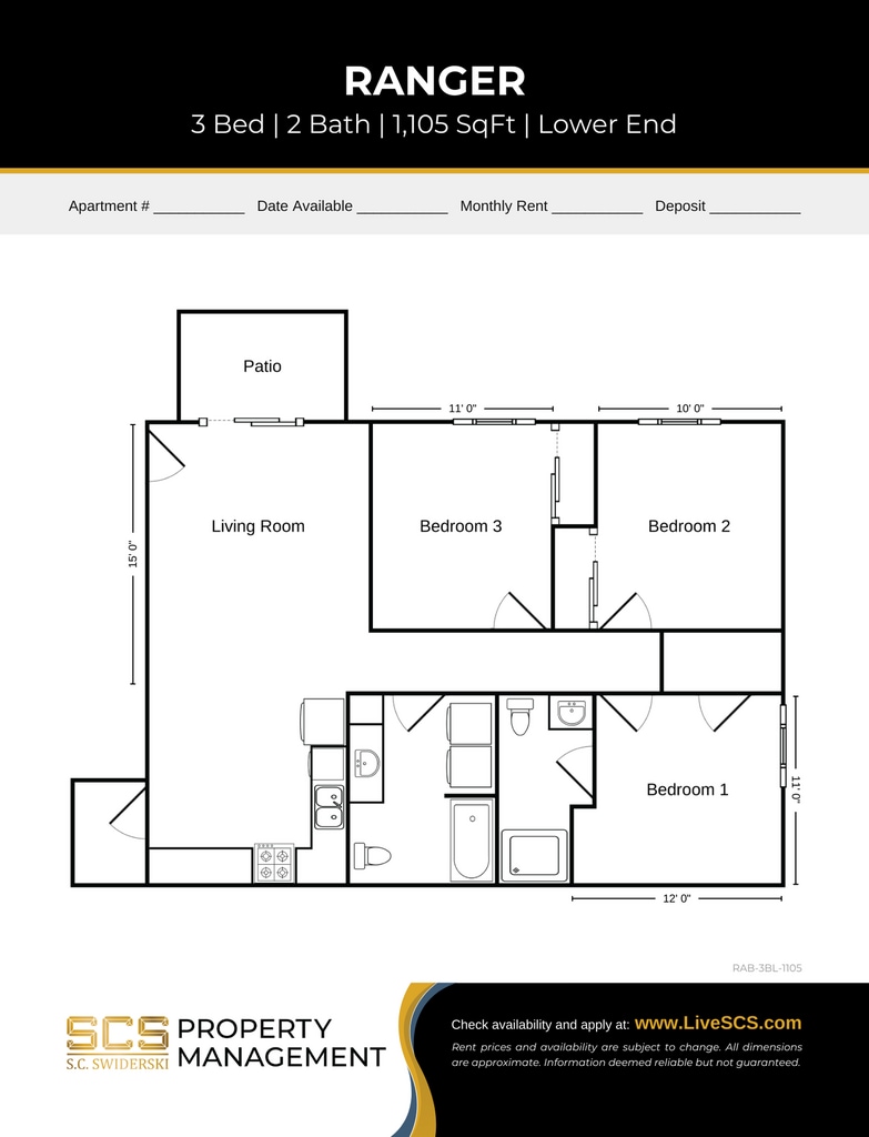 Modelo de apartamento: Ranger 3 BR Lower3 Dormitorios, 2 Baños, 1105 sq ftDisponible November 1, 2025PlanosFotosRanger 3 BR Lower - Imagen 1 Ranger 3 BR Lower - Imagen 2 Ranger 3 BR Lower - Imagen 3 Ranger 3 BR Lower - Imagen 4 Ranger 3 BR Lower - Imagen 5 Ranger 3 BR Lower - Imagen 6 Ranger 3 BR Lower - Imagen 7 Ranger 3 BR Lower - Imagen 8 Ranger 3 BR Lower - Imagen 9 Ranger 3 BR Lower - Imagen 10 Ranger 3 BR Lower - Plano 11 Unidad de apartamento: SB 415-01Modelo de apartamento: Ranger 3 BR Lower3 Dormitorios, 2 Baños, 1105 sq ftDisponible November 1, 2025Ranger 3 BR Upper