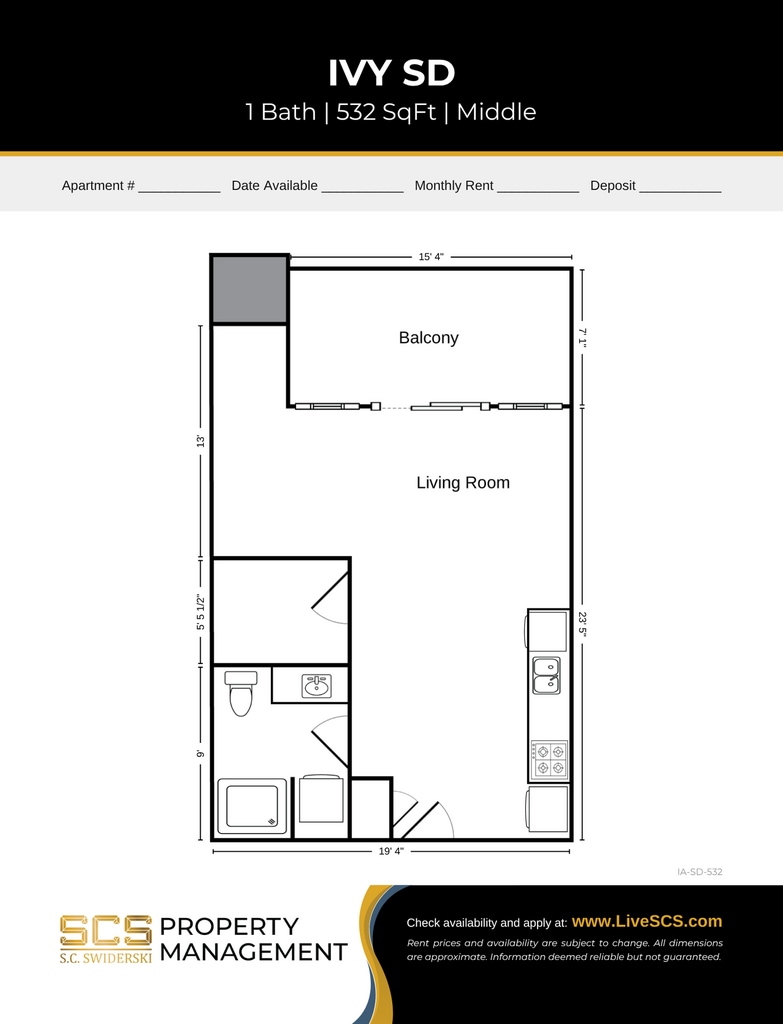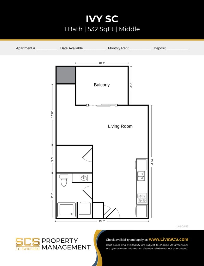 Modelo de apartamento: Ivy SCDesde $1,350Estudio, 1 Baño, 532 sq ftDisponible April 15, 2026PlanosFotos![]()