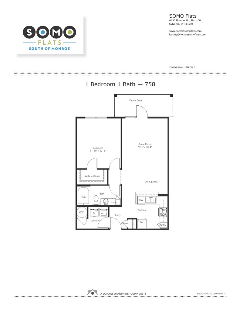 Birch 1.1 (U3) - Plano 1 Unidad de apartamento: 1-131Modelo de apartamento: Birch 1.1 (U3)1 Dormitorio, 1 Baño, 758 sq ftDisponible AhoraCherry 1.1 (U2)