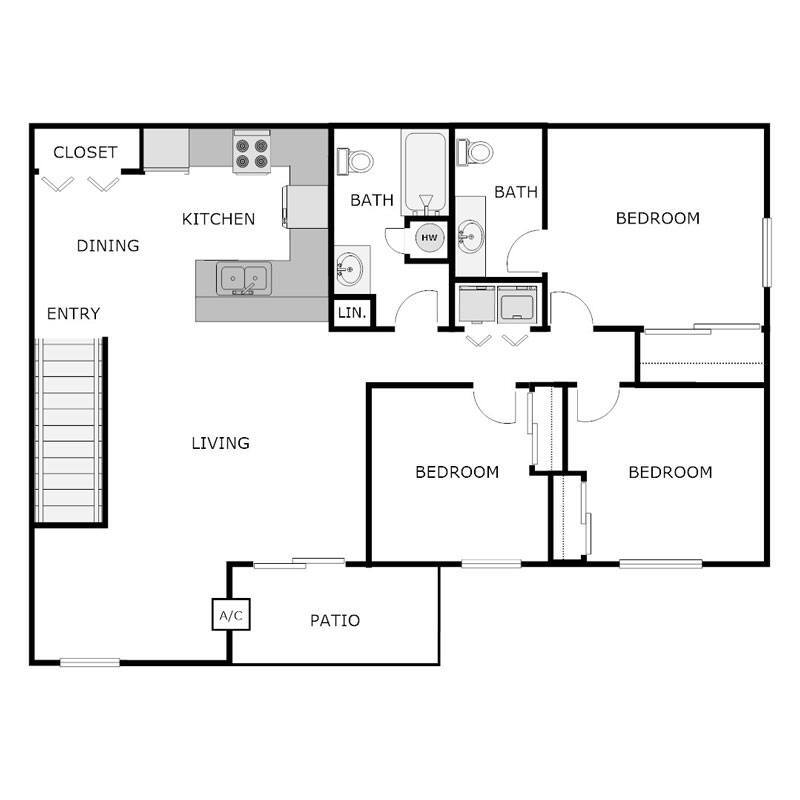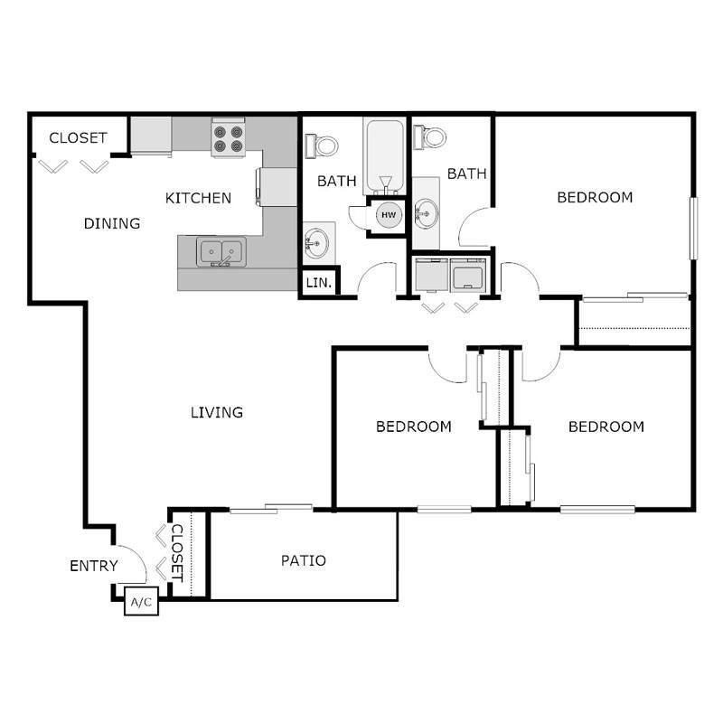 Modelo de apartamento: 3 Bedroom 1.5 Bathroom$1,2753 Dormitorios, 1.5 Baños, 1156-1249 sq ftDisponible December 31, 2025![]()