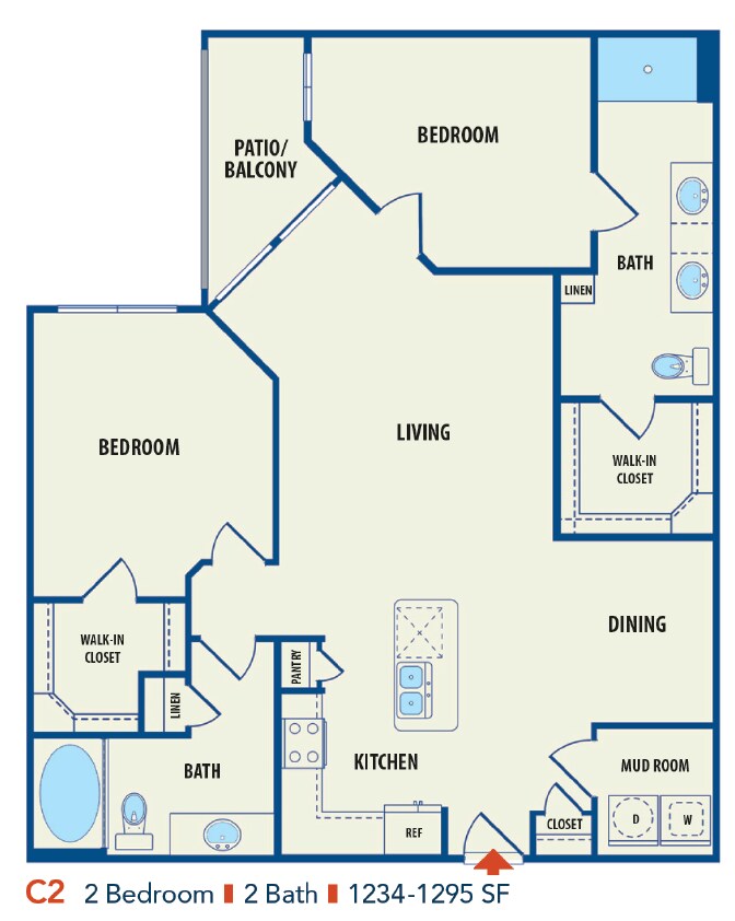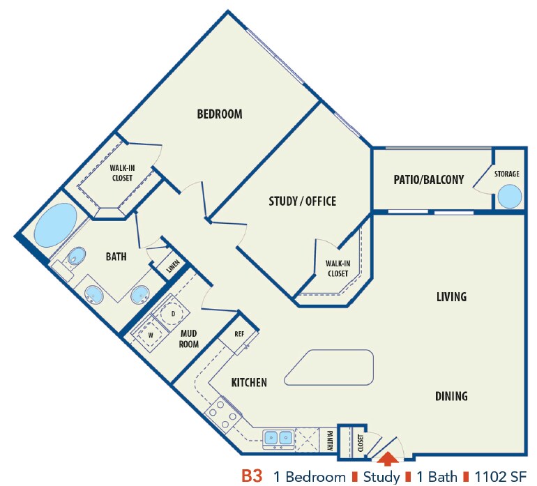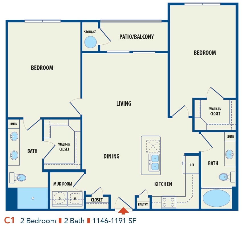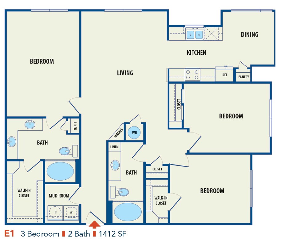 Modelo de apartamento: A1EDesde $1,2801 Dormitorio, 1 Baño, 680-733 sq ftDisponible Ahora![]()