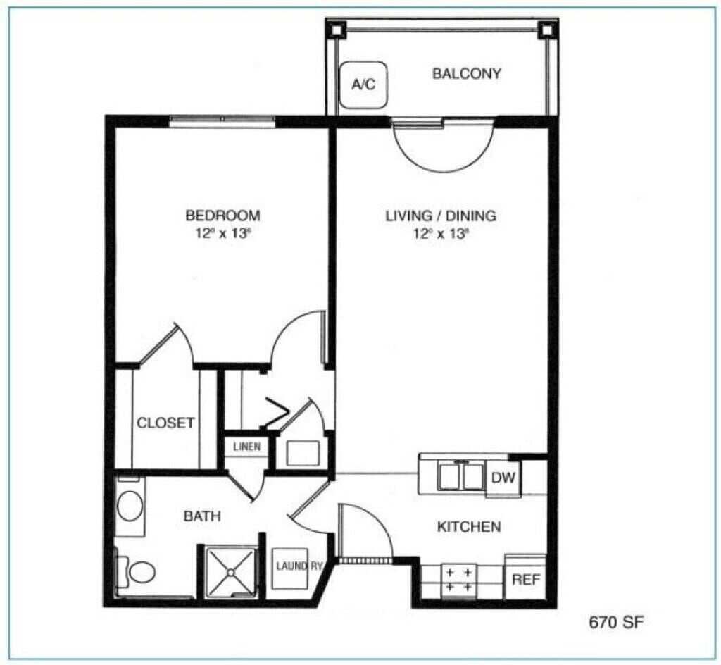 Modelo de apartamento: 1A1 Dormitorio, 1 Baño, 670 sq ftDisponible Ahora![]()