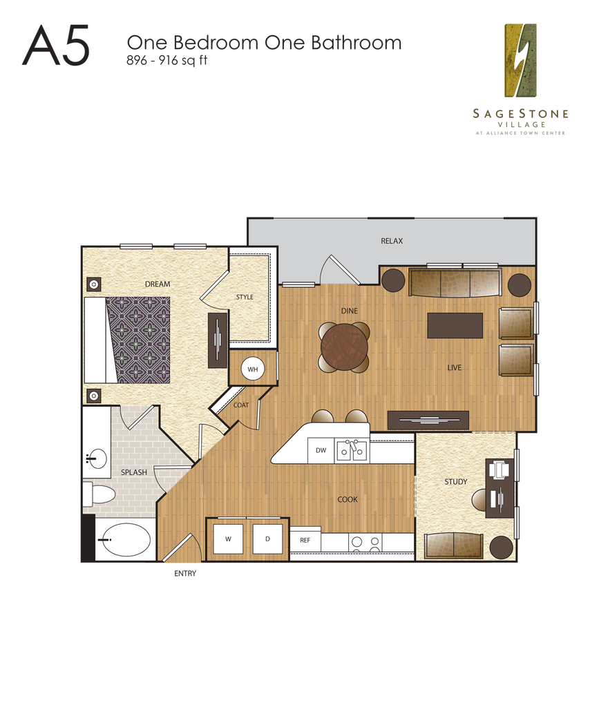 1 Dormitorio, 1 Baño, 819 pies²Disponible AhoraGalería del Modelo
