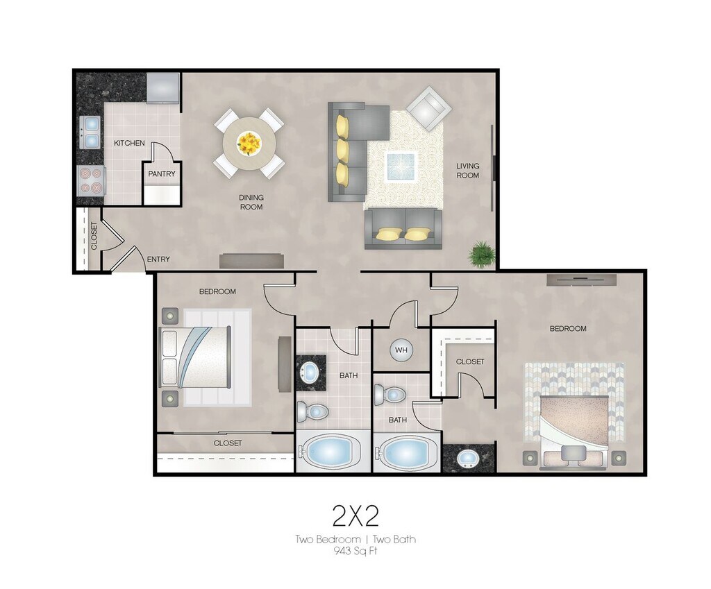 Modelo de apartamento: 2 Bedroom$8552 Dormitorios, 2 Baños, 943 sq ftDisponible Ahora![]()