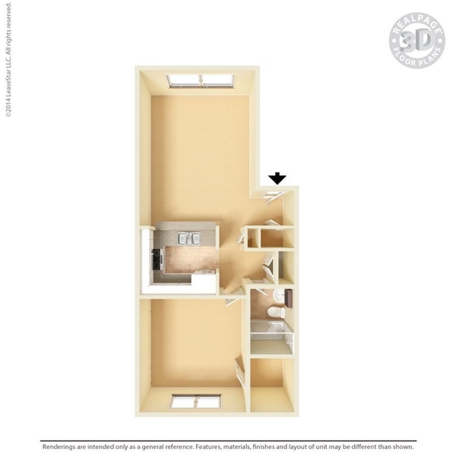 Large 1 Bed 0.75 Bath - Plano 1 Los planos de la planta son una interpretación artística. Todas las dimensiones son aproximadas. Los tamaños o el detalle del producto real y sus especificaciones pueden variar. No todas las características están disponibles en todos los hogares para rentar. Los precios y la disponibilidad están sujetos a cambios. El alquiler que se muestra es mensual. Se pueden aplicar ciertos cargos, por ejemplo, entrega de paquetes, recolección de basura, agua, servicios, etc. Depositos varian. Consulta a un representante para conocer detalles.