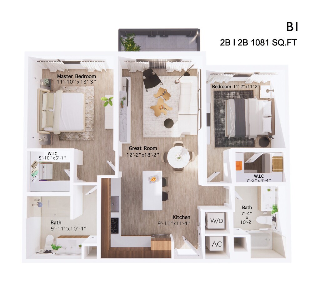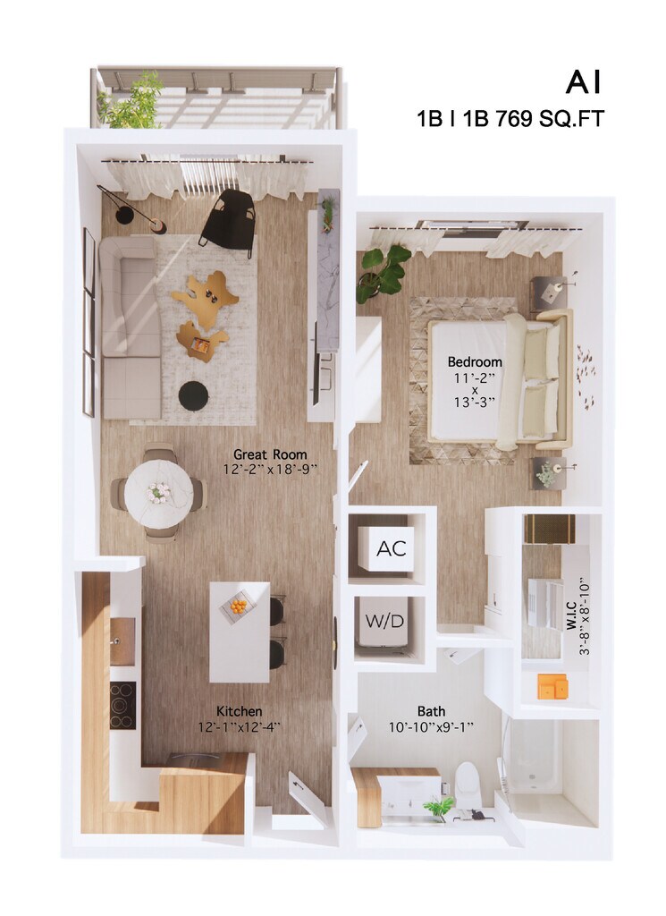 1 Dormitorio, 1 Baño, 769 pies²Disponible AhoraGalería del Modelo