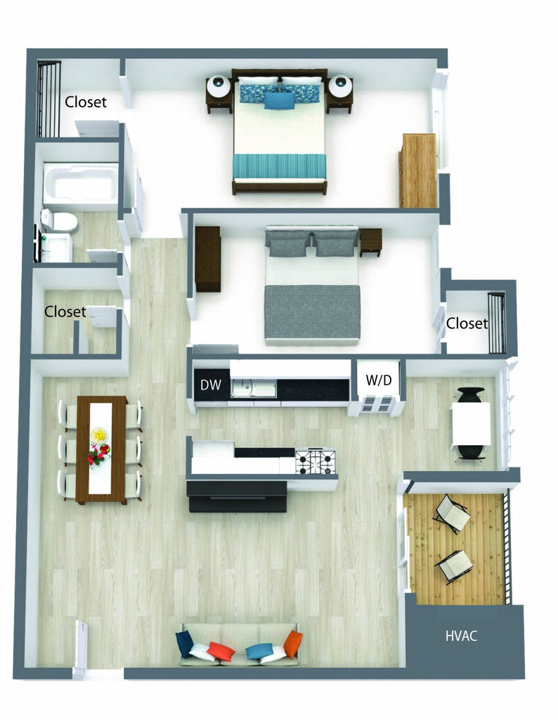 2 Dormitorios, 1 Baño, 1018 pies²Disponible AhoraGalería del Modelo